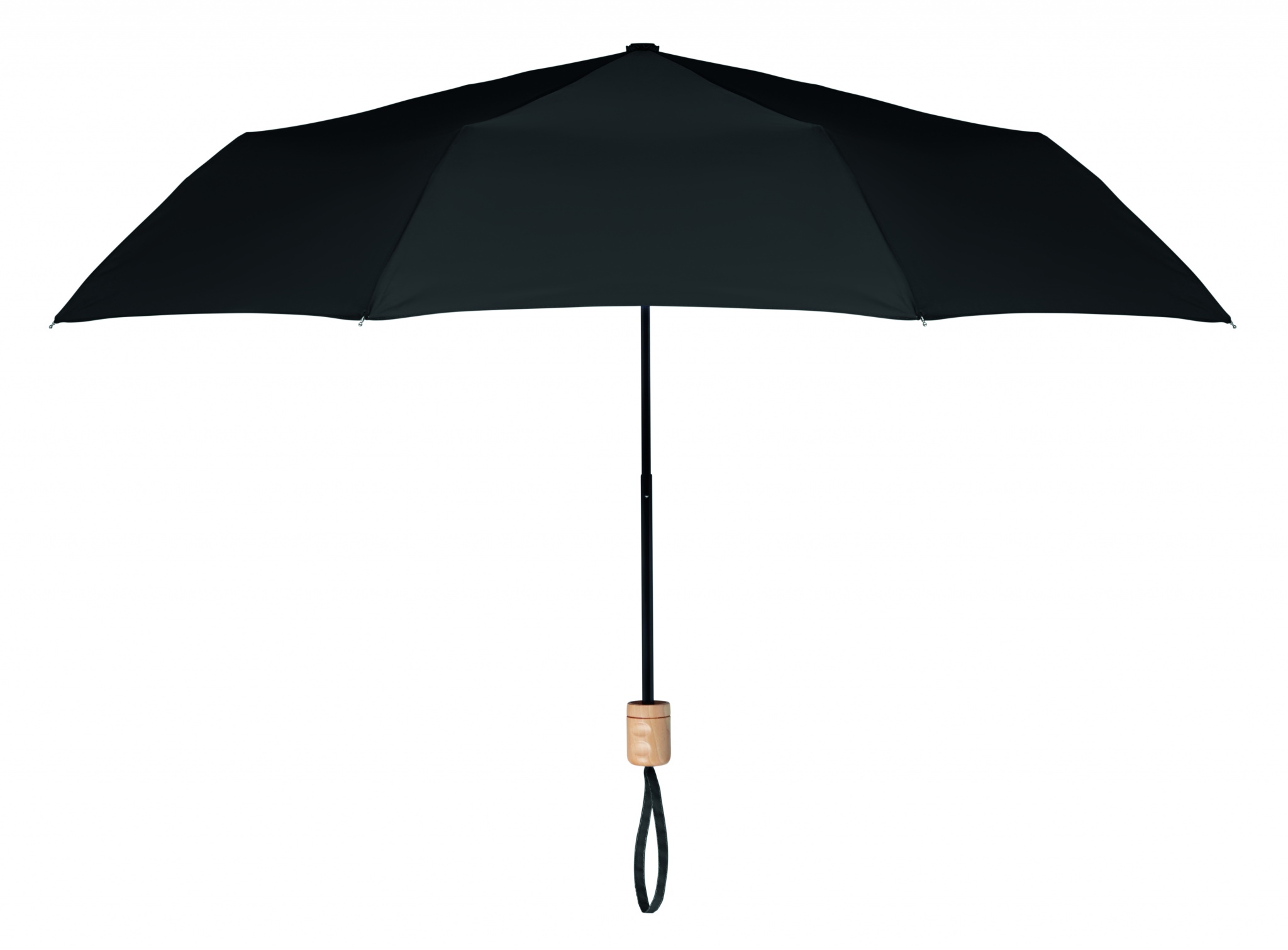 190T RPET-pongee 21 tuuman kokoontaitettava myrskysateenvarjo. Mustalla päällystetty runko ja ruoteet, puinen kahva. Manuaalinen avaus / suljin, sisältää yhteensopivan säilytyspussin.