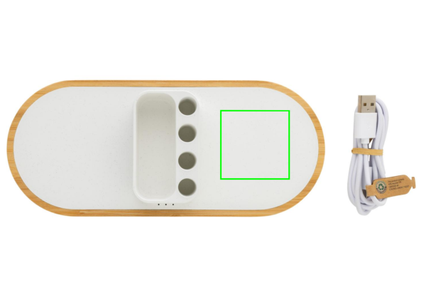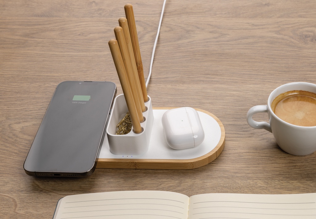 10W langaton pikalaturi kynäpidikkeellä valmistettuna RCS (Recycled Claim Standard) sertifioidusta kierrätetystä ABS:stä. Kierrätetyn materiaalin kokonaismäärä: 31% perustuen tuotteen painoon. RCS sertifiointi varmistaa kierrätettyjen materiaalien täysin sertifioidun toimitusketjun. Pohja on valmistettu FSC®100% bambusta. Langaton lataus yhteensopiva Androidin uusimpien sukupolvien, iPhone 8 ja uudempien, kanssa. Samaan aikaan voidaan ladata kahta puhelinta. 4 kynäreikää kynien säilytykseen sekä tilaa käyntikorteille tai muille pienille tavaroille. Tuote ja lisätarvikkeet PVC-vapaita. Sisältää 120cm tyypin C latauskaapelin, joka on valmistettu RCS sertifioidusta kierrätetystä TPE:stä. Pakattu FSC®-sekoituksesta valmistettuun kraft-pakkaukseen. Tyypin C tulovirta:5V/2A; 9V/2A; langaton ulostulo: 5V/1A; 9V/1.1A; (10W) Rekisteröity design®