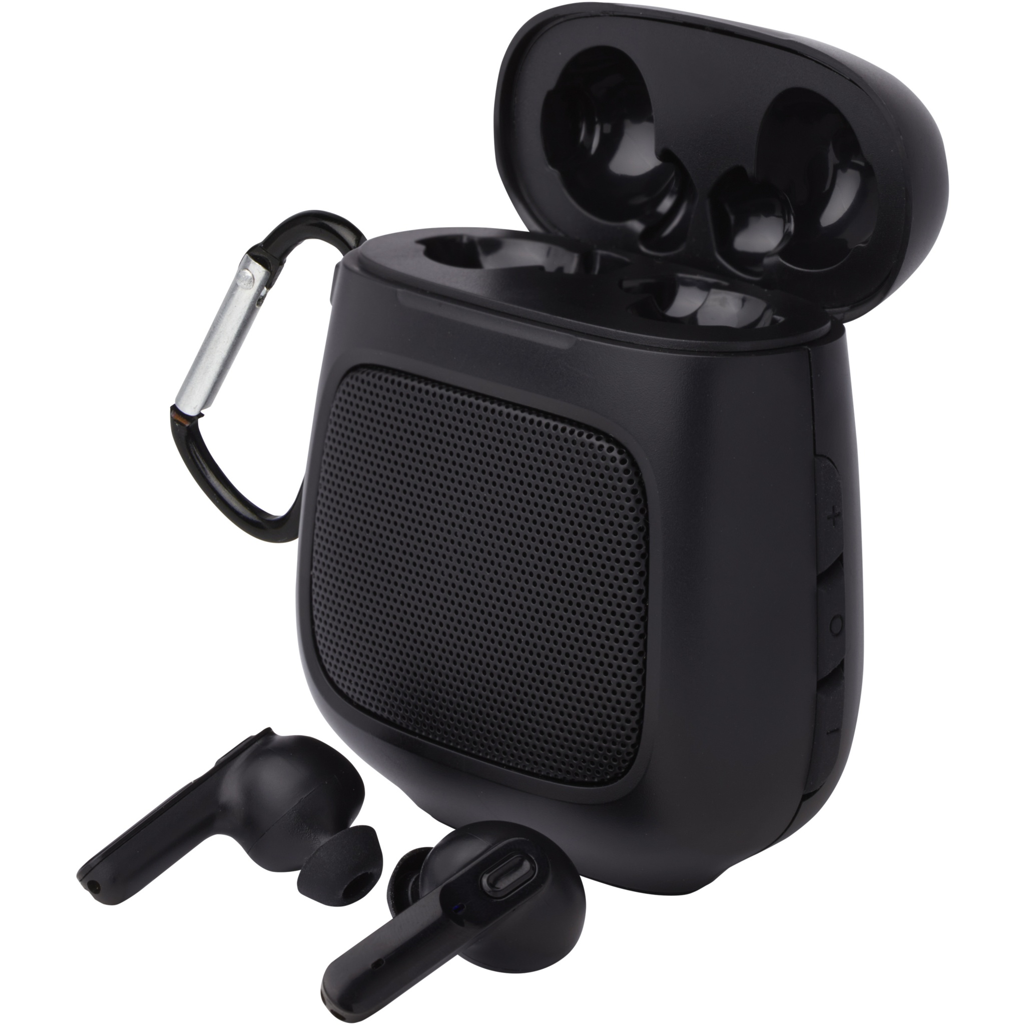 Tämä Remix yhdistää True Wireless -nappikuulokkeet Bluetooth® -kaiuttimeen. Kun nappikuulokkeet otetaan kotelosta, ne kytkeytyvät päälle ja synkronoituvat automaattisesti keskenään. Kuljetuskotelo toimii myös nappikuulokkeiden latausasemana sekä Bluetooth® -kaiuttimena. Kotelo pystyy lataamaan varauksesta tyhjät nappikuulokkeet täyteen neljä kertaa yhdellä latauksella, ja nappikuulokkeita voidaan käyttää vähintään 4 tuntia ennen uusintalatauksen tarvetta. Ergonominen muotoilu pitää nappikuulokkeet mukavasti ja varmasti paikoillaan liikkeessä ollessasi. Nappikuulokkeiden lataaminen tyhjistä täyteen kestää noin kaksi tuntia. Sekä nappikuulokkeissa että kaiuttimessa on sisäänrakennettuina mikrofoni ja musiikkisäätimet puheluiden vastaanottamista tai soittamista varten. Bluetoothin toiminta-alue on 10 metriä. Mukana keskikokoiset ja suuret korvasovittimet. Toimitetaan premium-lahjapakkauksessa.