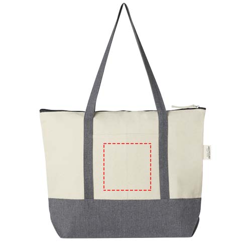 Vetoketjullinen Repose 320 g/m² kassi on valmistettu ympäristöystävällisestä tuotannossa kierrätetystä puuvillasta. Vetoketjullinen päälokero, trendikkäät värit, tasku edessä ja 27 cm:n kahvat. Kantokyky 10 kg.