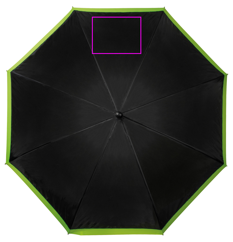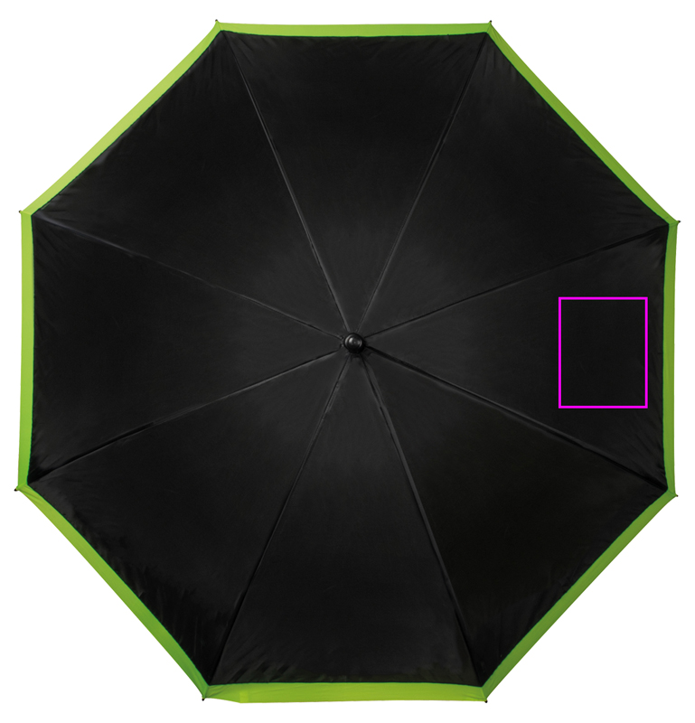 Suuri sateenvarjo, joka kiinnittää huomiota itseensä ja logoosi musta-neon- ja keltaisen värikontrastinsa ansiosta (190T polyesteri.) Painamme logosi segmenttiin.