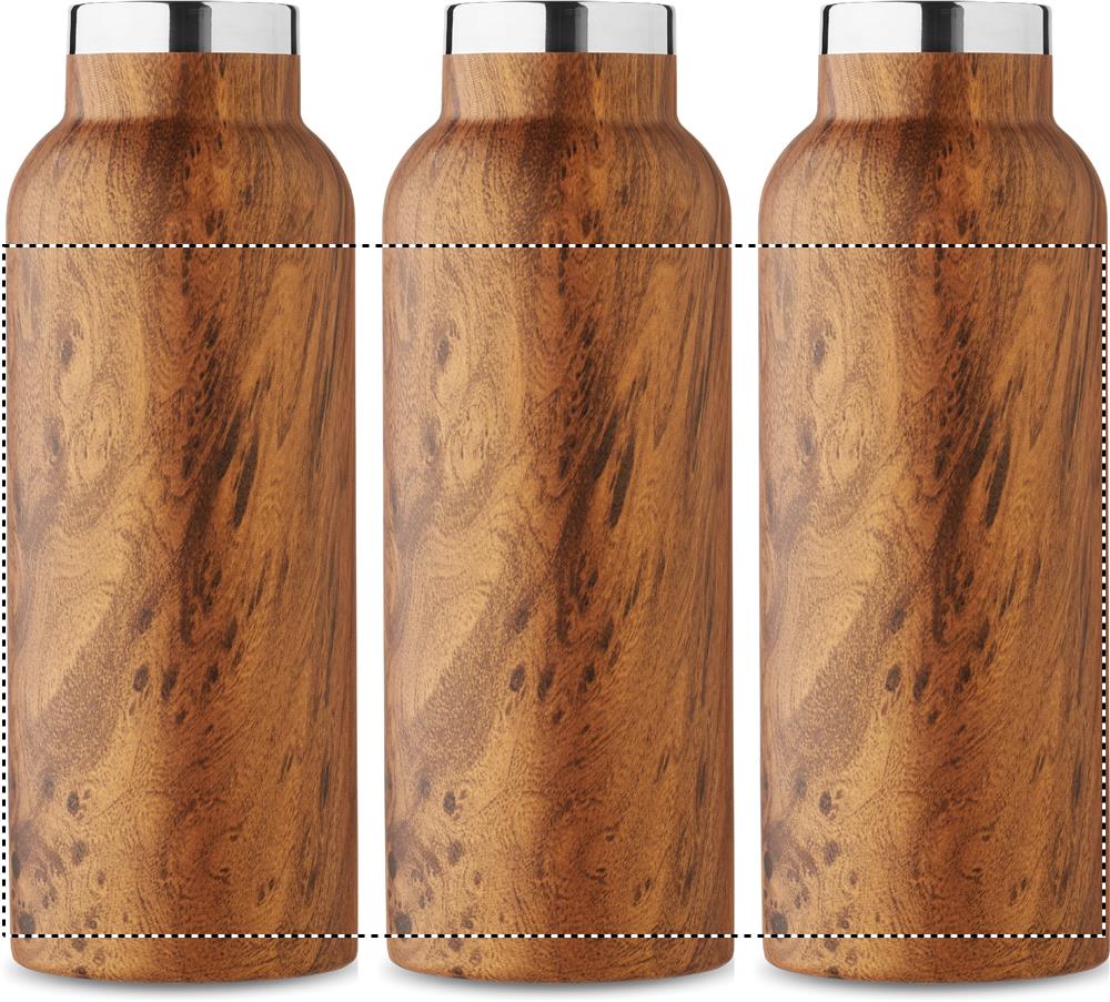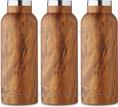 Kaksiseinäinen eristävä tyhjiöpullo kierrätetystä ruostumattomasta teräksestä (90 % kierrätettyä ruostumatonta terästä ja 10 % ruostumatonta terästä). Pullossa puupintaa jäljittelevä pinnoite ja kantokahvainen korkki. Vuotamaton. Tilavuus: 500 ml.