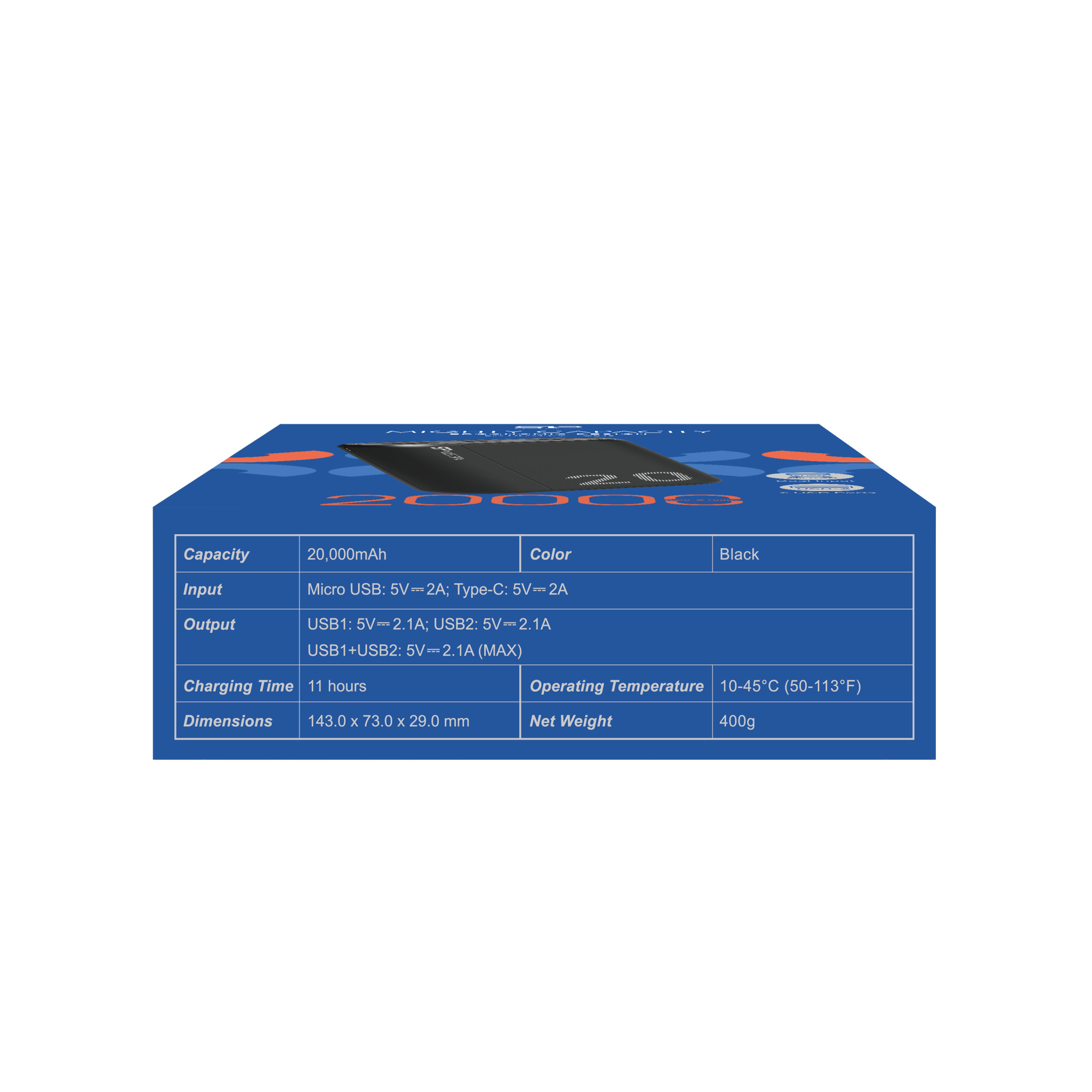 Ensiluokkaiset akkukennot tarjoavat tarpeeksi virtaa lähes minkä tahansa älypuhelimen lataamiseen 2–4 täyteen kertaan, päivien ajan missä tahansa. Ylivertaiset materiaalit korkealaatuisessa rakenteessa tekevät siitä uskomattoman kestävän, mutta silti mukavan pitää sen ergonomisen muodon ansiosta. Tekniset tiedot: Kaksoistulo Micro-B & Type-C, kaksois-USB-lähtö 2.1A, 20000mAh. Akku: Li-polymeeri. Väri: musta