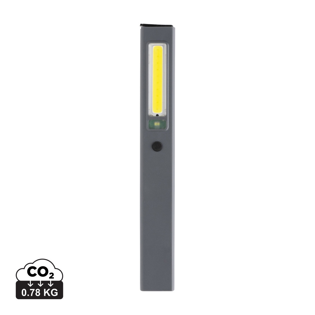 Kišeninio dydžio tikrinimo lemputė pagaminta iš RCS sertifikuoto perdirbto ABS plastiko. Bendras perdirbtas turinys: 33% pagal bendrą prekės svorį. RCS sertifikatas užtikrina visiškai sertifikuotą perdirbtų medžiagų tiekimo grandinę. Darbo lemputė naudoja pakartotinai įkraunamą A klasės 520 mah ličio bateriją, todėl baterijų keisti nereikia. Tiesiog iš naujo įkraukite per USB lizdą. Darbinis šviestuvas yra su 220 liumenų COB šviesa ir 80 liumenų LED šviesa. Su 3 režimais: LED, COB ir COB raudona. Su segtuku pritvirtinimui prie diržo arba kišenės ir magnetu. Su C tipo prievadu pakartotiniam įkrovimui. Veikimo laikas vienu įkrovimu: 3 valandos.