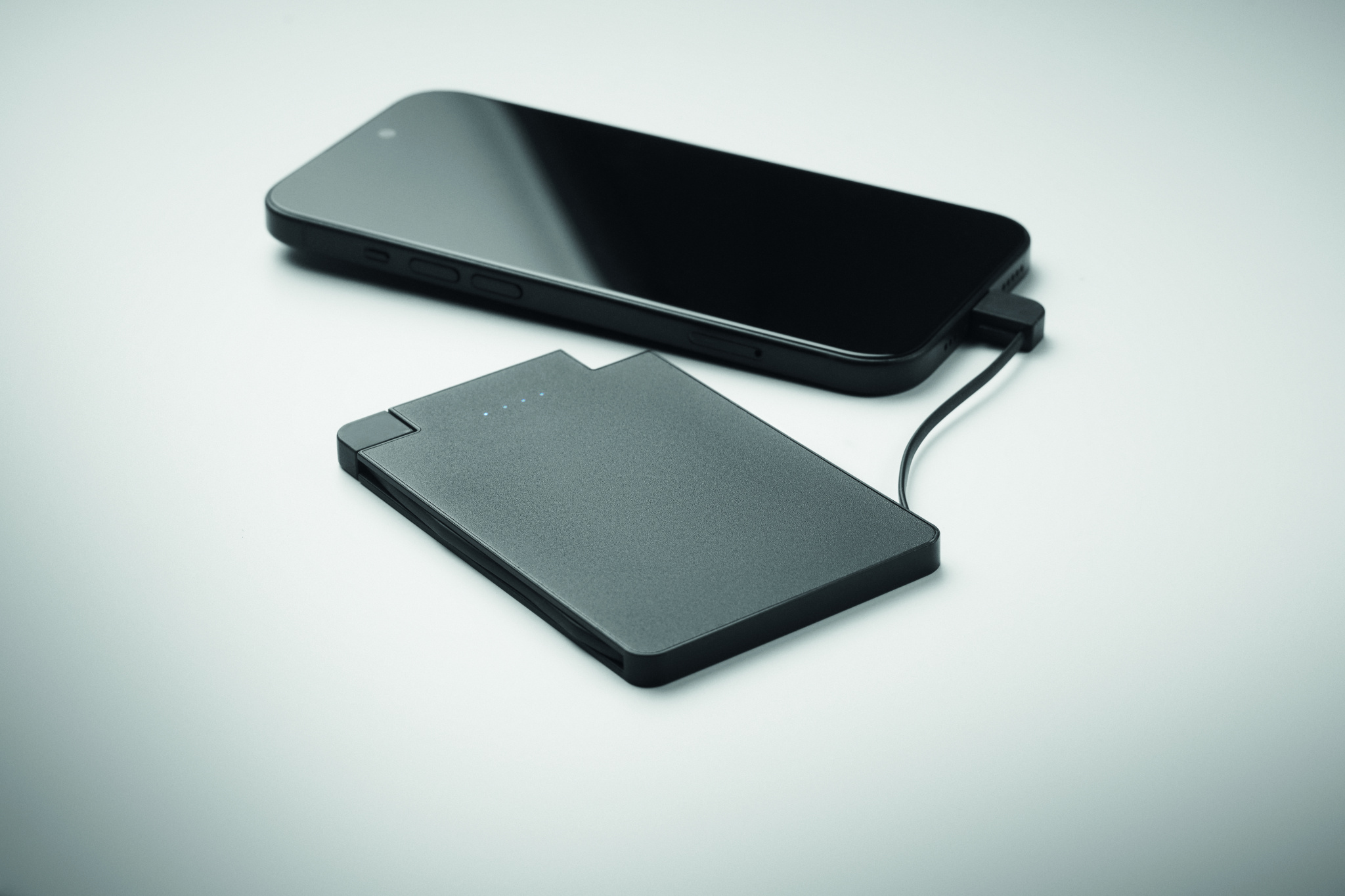 Kortelės dydžio maitinimo blokas 2500 mAh talpos ABS su įmontuotais laidais. „Powerbank“ prilimpa prie „iOs“ telefonų su magnetinėmis savybėmis. Įvestis: C tipo ir C tipo išvesties bei IOS įrenginiai suderinami.