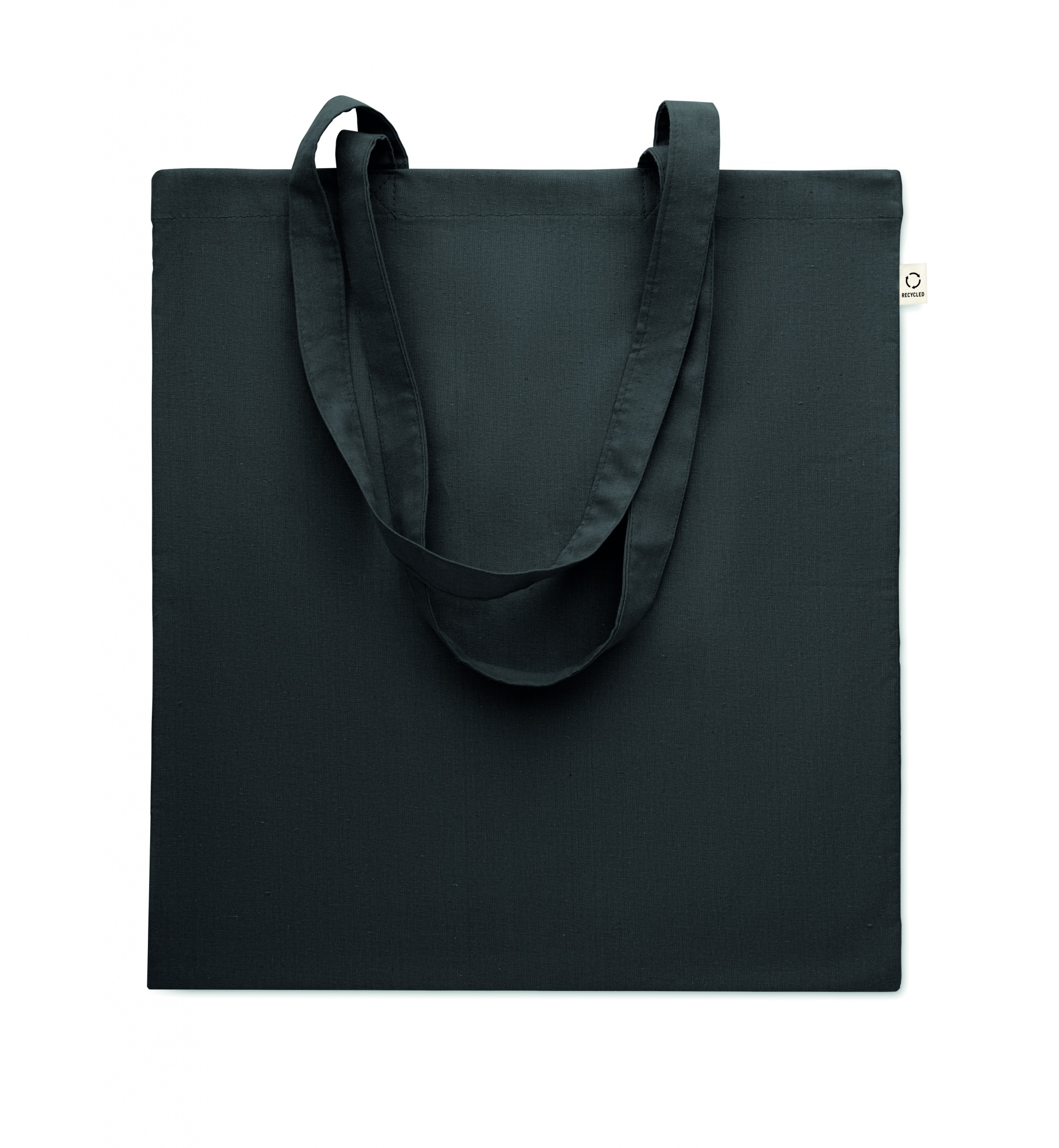 Perdirbtos medvilnės pirkinių krepšys (70 % perdirbtos medvilnės ir 30 % RPET) ilgomis rankenomis. 140 gr/m².