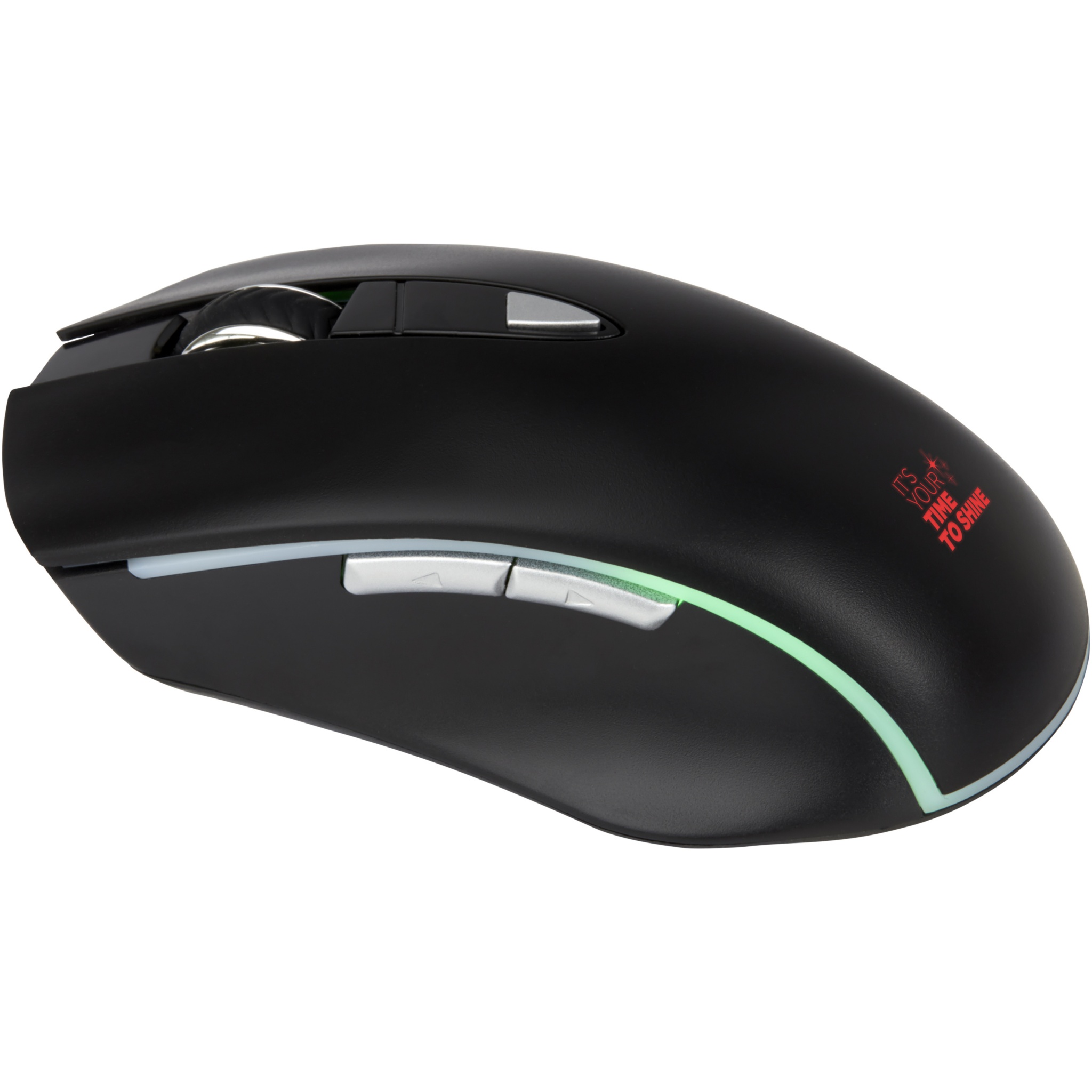 Ergonomiška belaidė pelė, puikiai priglundanti prie delno. Puiki riešo atrama ilgoms darbo/žaidimų valandoms. Pelė turi 3 DPI nustatymus (800/1200/1600), atitinkančius visus jautrumo reikalavimus. Integruota 400 mAh įkraunama ličio baterija užtikrina iki 20 valandų naudojimo, kai įjungtas LED. Papuoštas graviravimu lazeriu, logotipas užsidegs ir spindės. LED spalva keičiasi atsitiktinai.