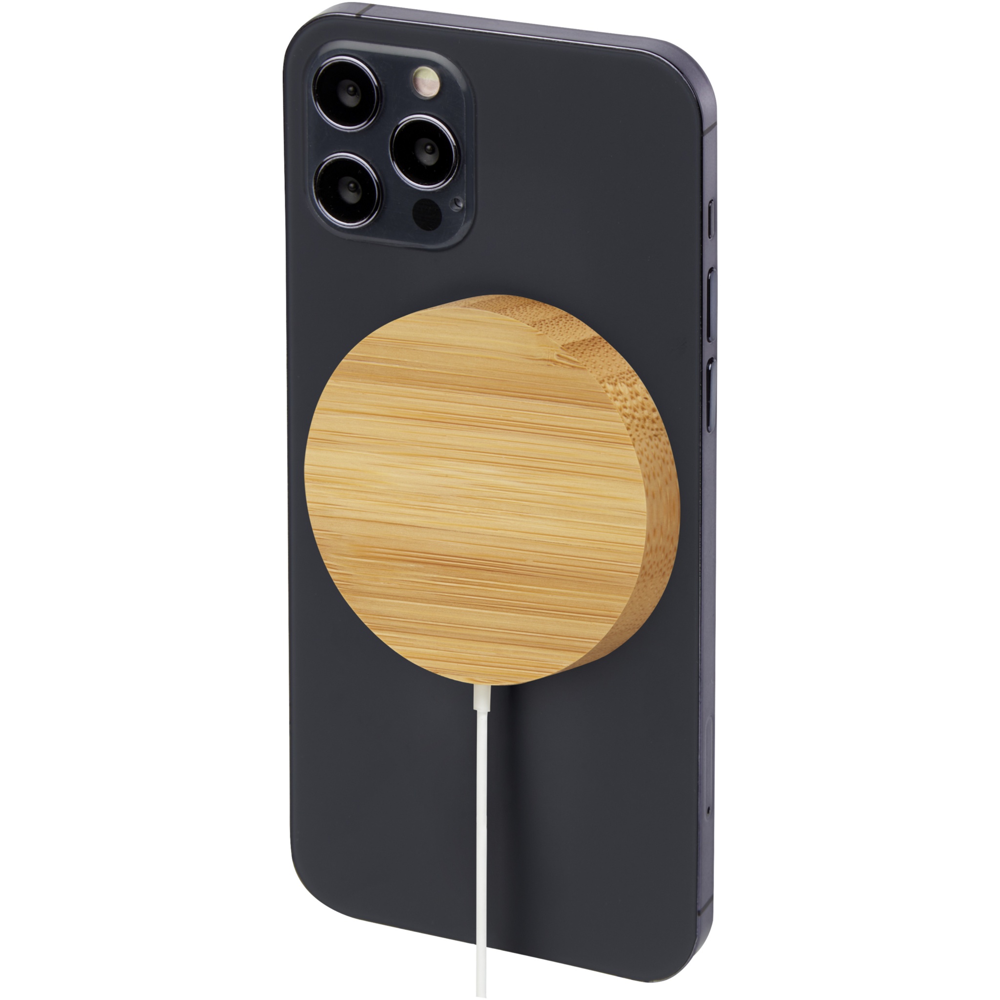 Bezvadu magnētiskais bambusa uzlādes paliktnis, ko var piestiprināt tālruņa aizmugurē (iPhone 12/iPhone 12 Pro / iPhone 12 Pro MAX), lai uzlādētu ierīci. 10 W bezvadu lādētājs ir savietojams ar visām Qi ierīcēm (iPhone 8 vai jaunākām ierīcēm un Android ierīcēm, kas atbalsta bezvadu uzlādi), un citiem tālruņiem to var izmantot kā parastu bezvadu uzlādes paliktni. Komplektā ir papildu metāla gredzens ar dubultu lenti, lai padarītu vienumu saderīgu ar jebkuru citu viedtālruni, kuram ir bezvadu uzlādes iespēja. Tiek piegādāts dāvanu kastītē ar lietošanas instrukciju (abas izgatavotas no ilgtspējīga materiāla).