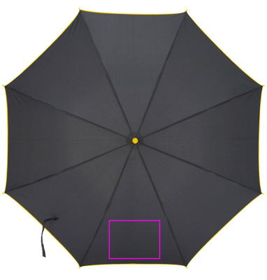 Automātiskais lietussargs no 190T pongee ar stikla šķiedras stabiem, plastmasas rokturi, krāsainu apmali, rokturi un rāmi. Mēs drukājam jūsu logotipu vienā segmentā.