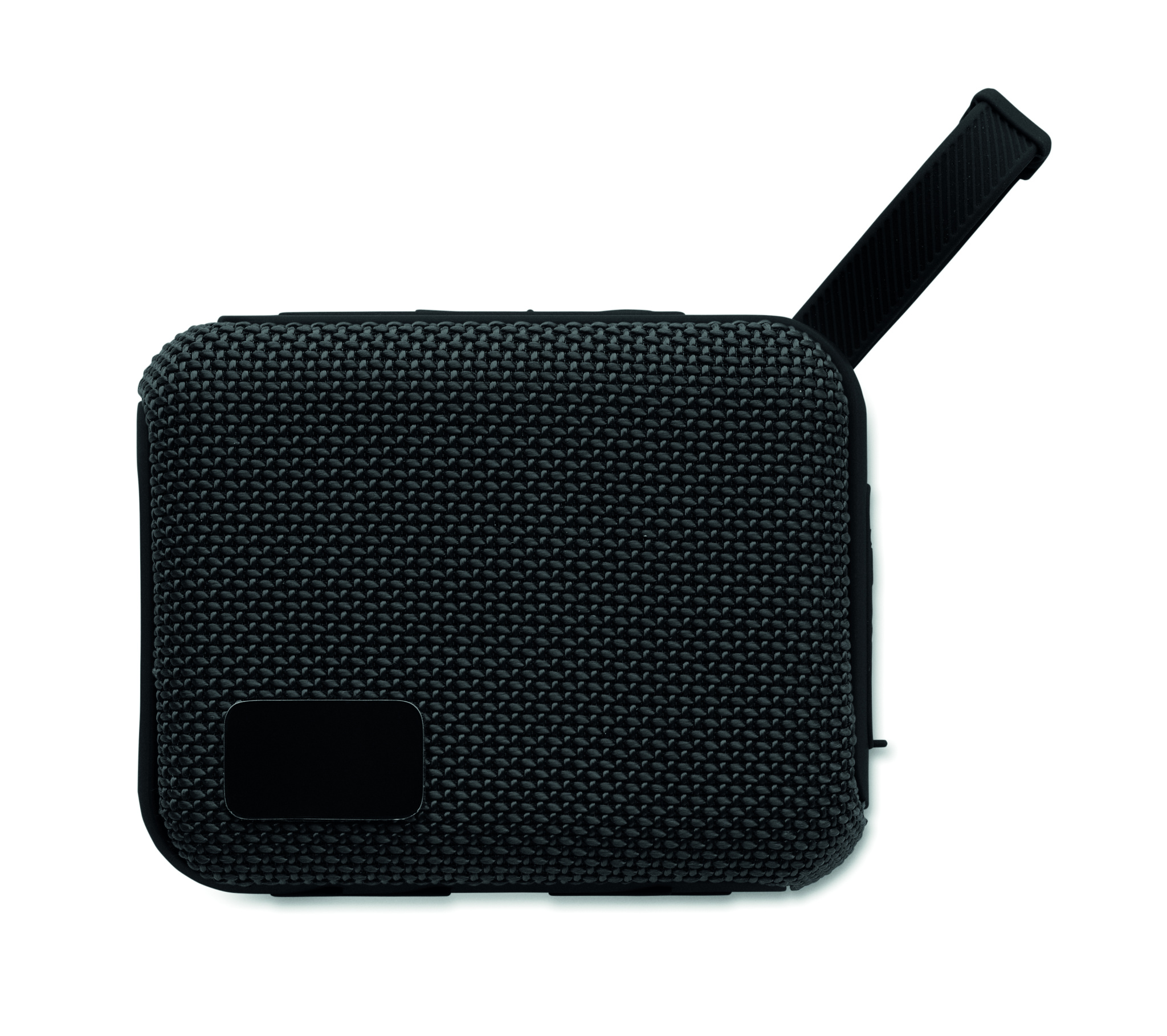 5.0 wireless speaker in ABS with RPET fabric and hanging cord. 1 Rechargeable Li-ION 800 mAh battery included. Includes an SD card port and an AUX/ USB cable. Output data: 5W, 3 Ohm and 5V. Playing time approx. 3h