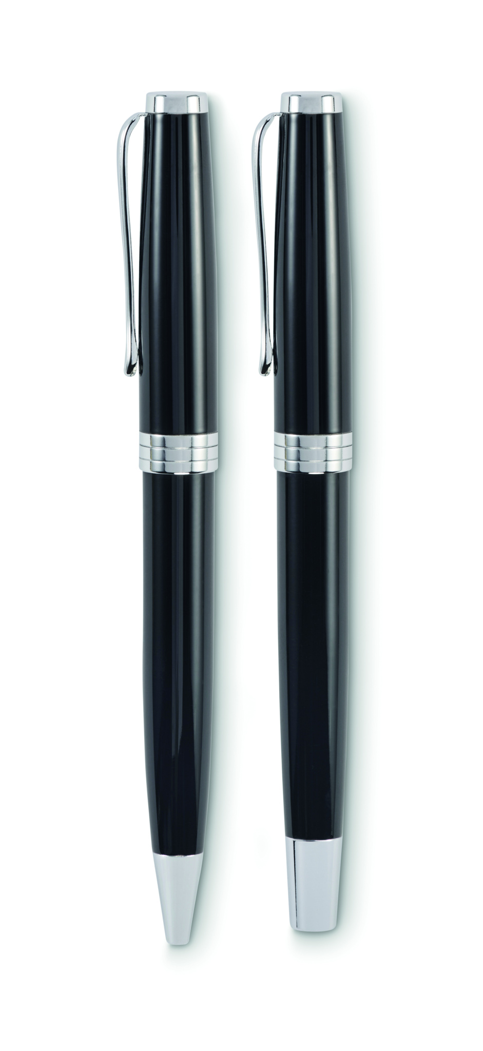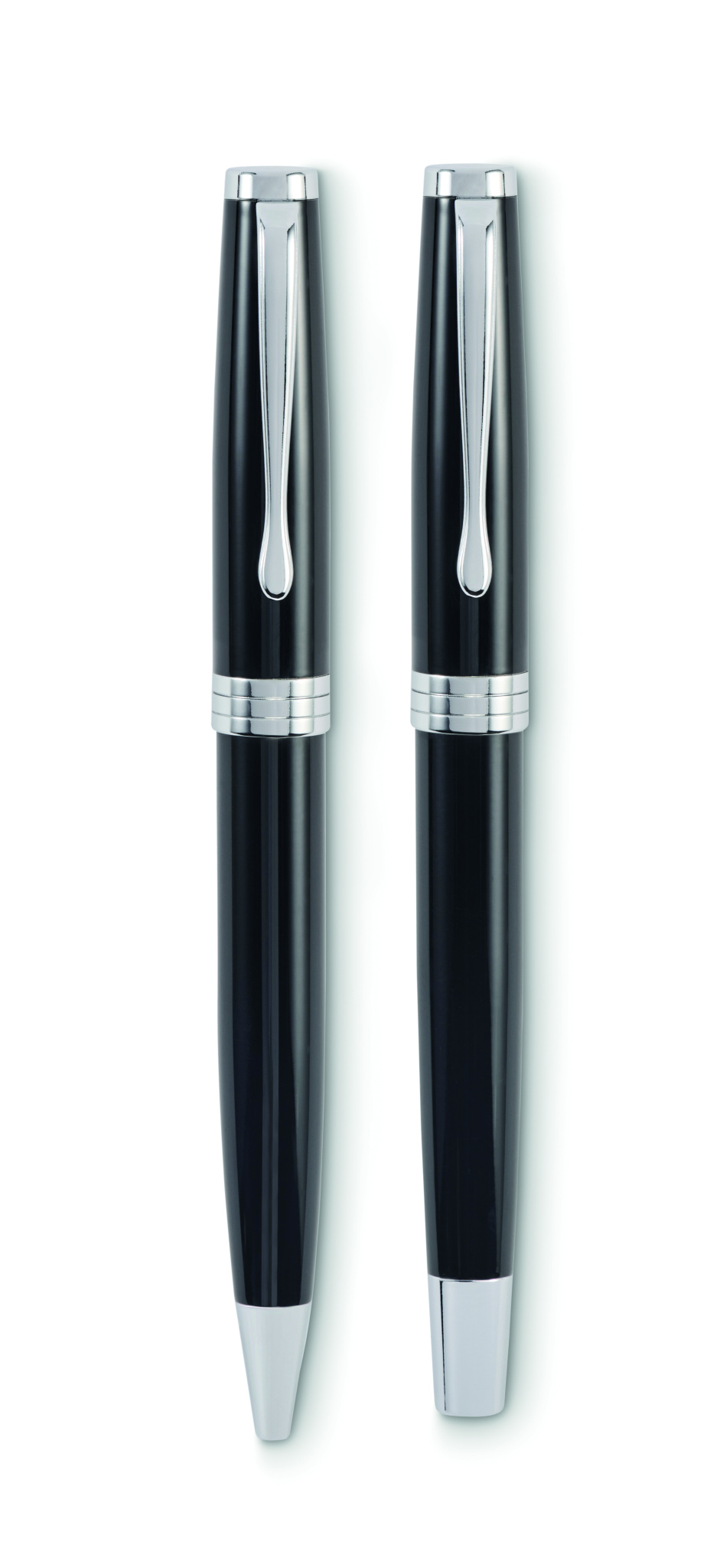 Set of twist ball pen and roller in recycled stainless steel barrel. Blue and black ink respectively. Presented in gift box.