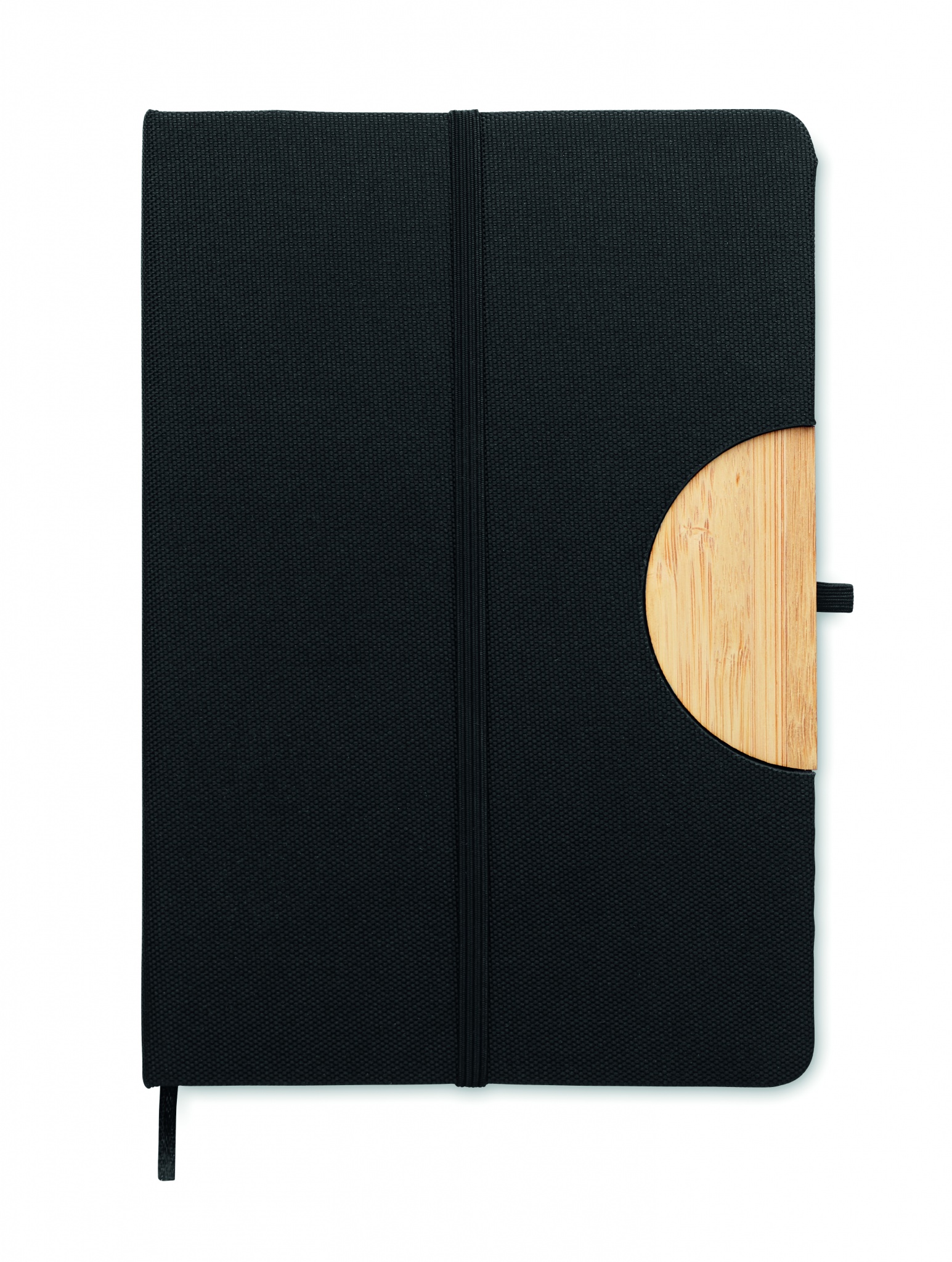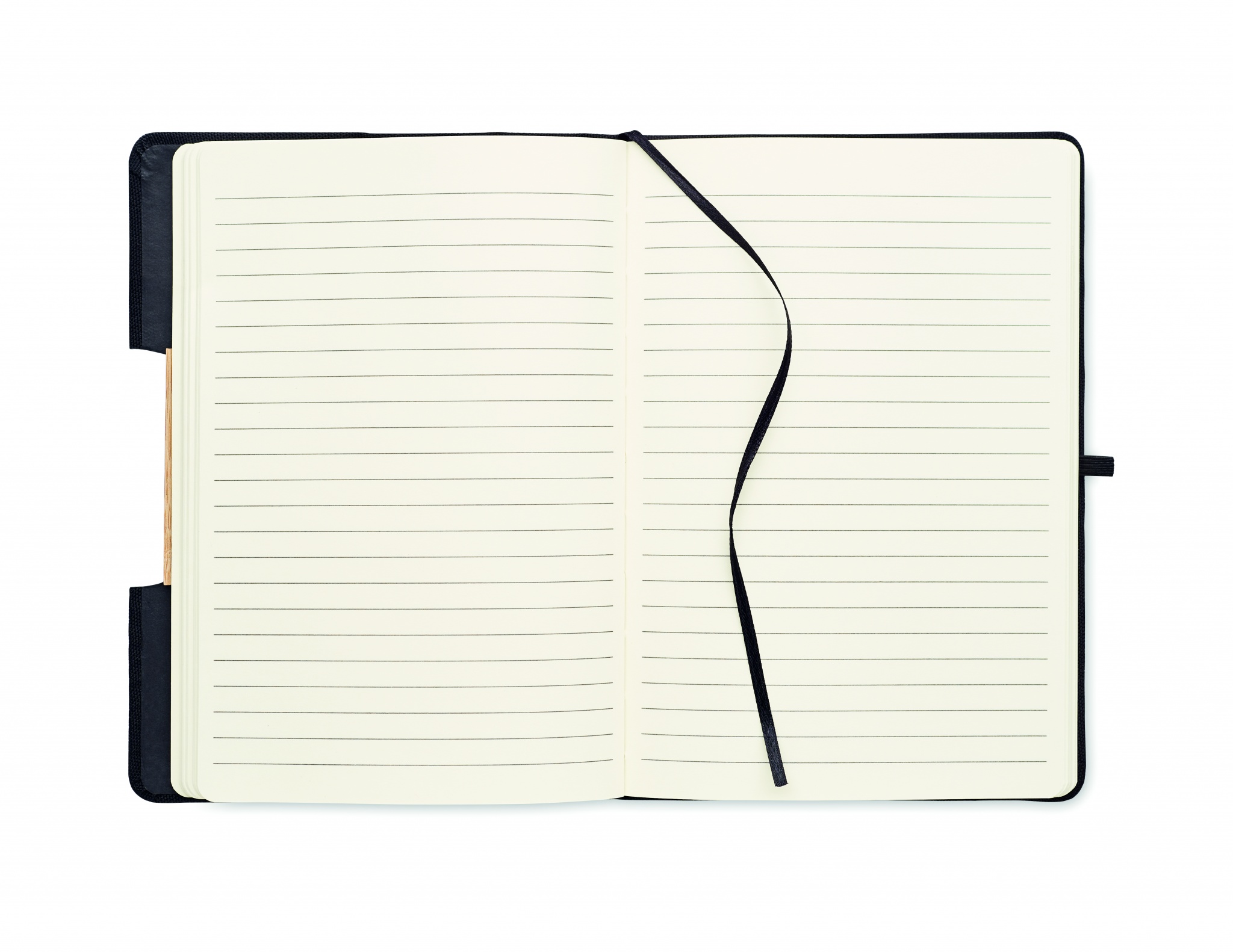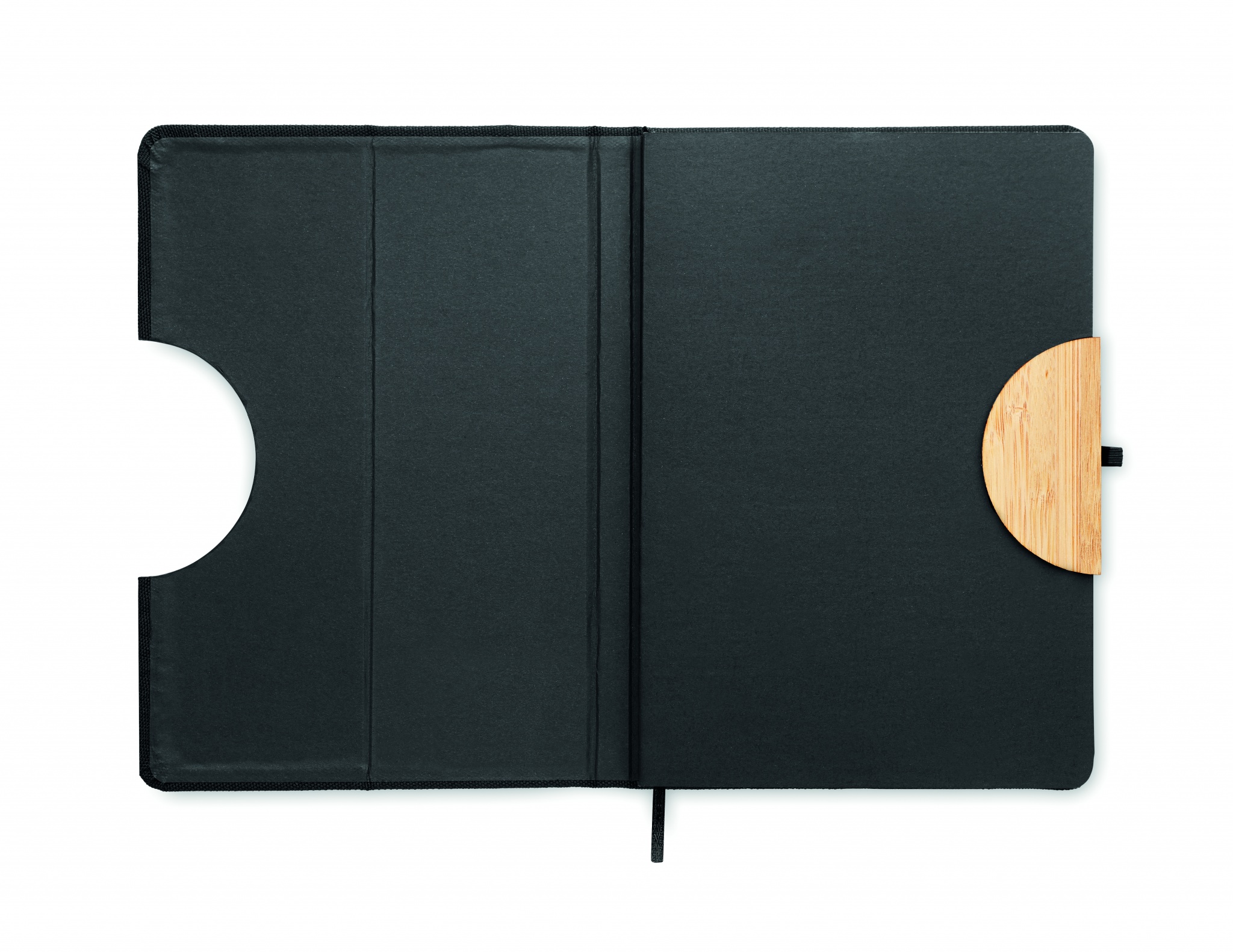 Блокнот формата A5 в твердой обложке из 600D RPET и бамбуковыми деталями с функцией подставки для смартфона. В переплете. 160 линованных страниц (80 листов). Переработанная бумага 70 гсм. Эластичный ремешок в тон, закладка для страниц и держатель для ручки.
