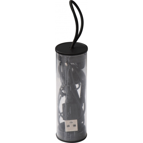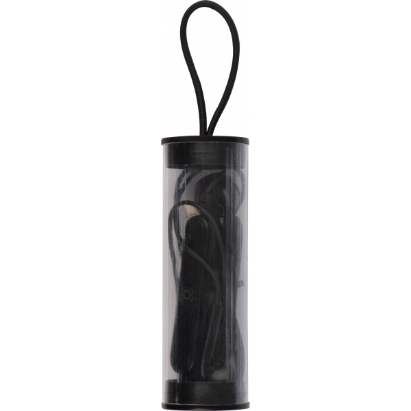 Bluetooth-гарнитура с регулятором громкости и USB-кабелем для зарядки в пластиковом корпусе с петлей для подвешивания. На корпусе напечатаем ваш логотип.