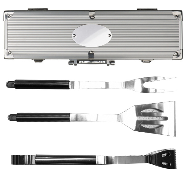 Чехол для барбекю, состоящий из щипцов для барбекю, вилки для мяса и лопатки для барбекю в металлическом чехле. Мы наносим лазером ваш логотип на овальную металлическую пластину чехла.