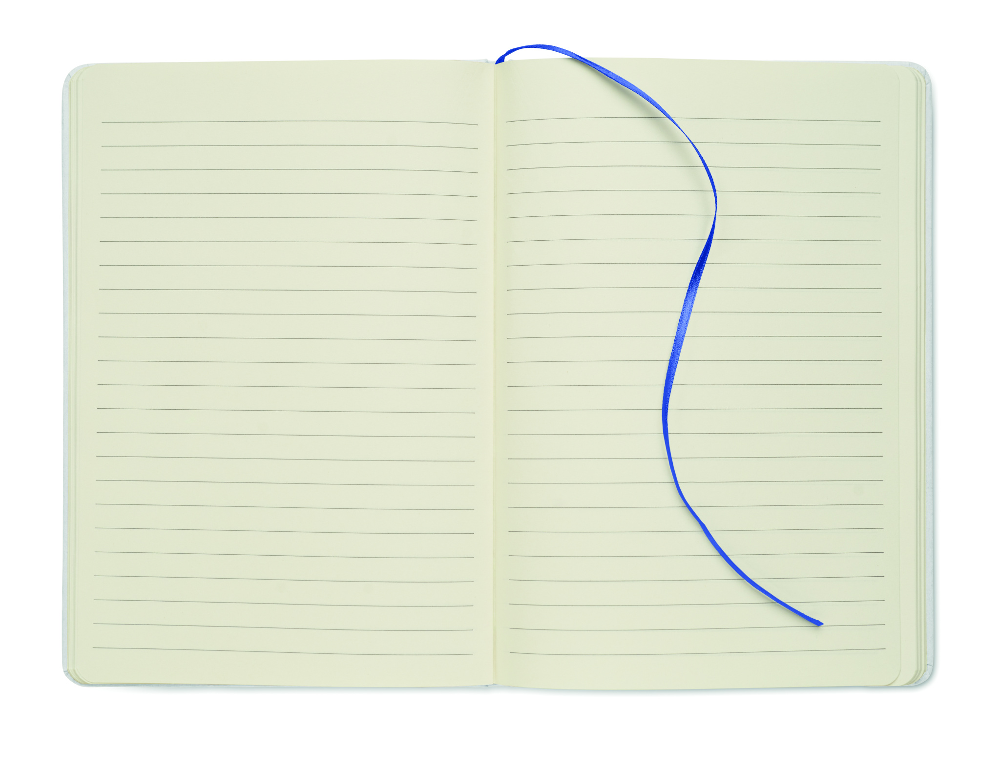 A5 notebook with hard recycled carton cover. White cover. Casebound. 160 lined recycled paper pages (80 sheets). Elastic closure strap, ribbon bookmark matching with revealed colour. After laser engraving the colour is revealed.