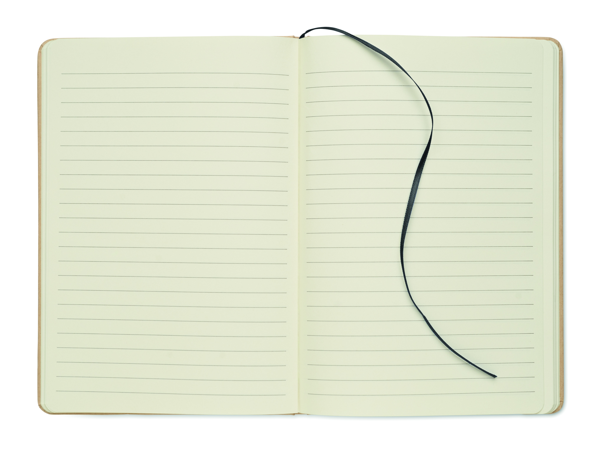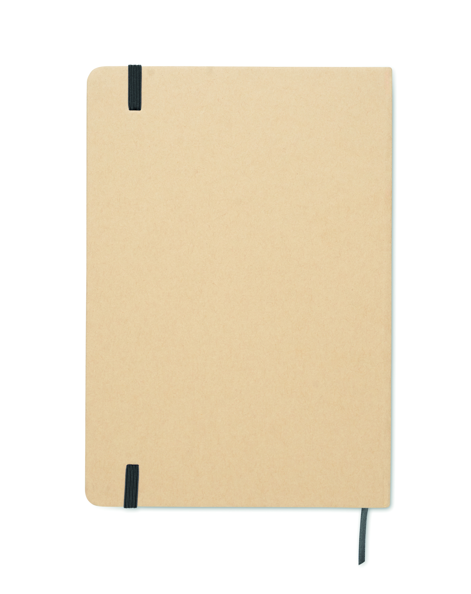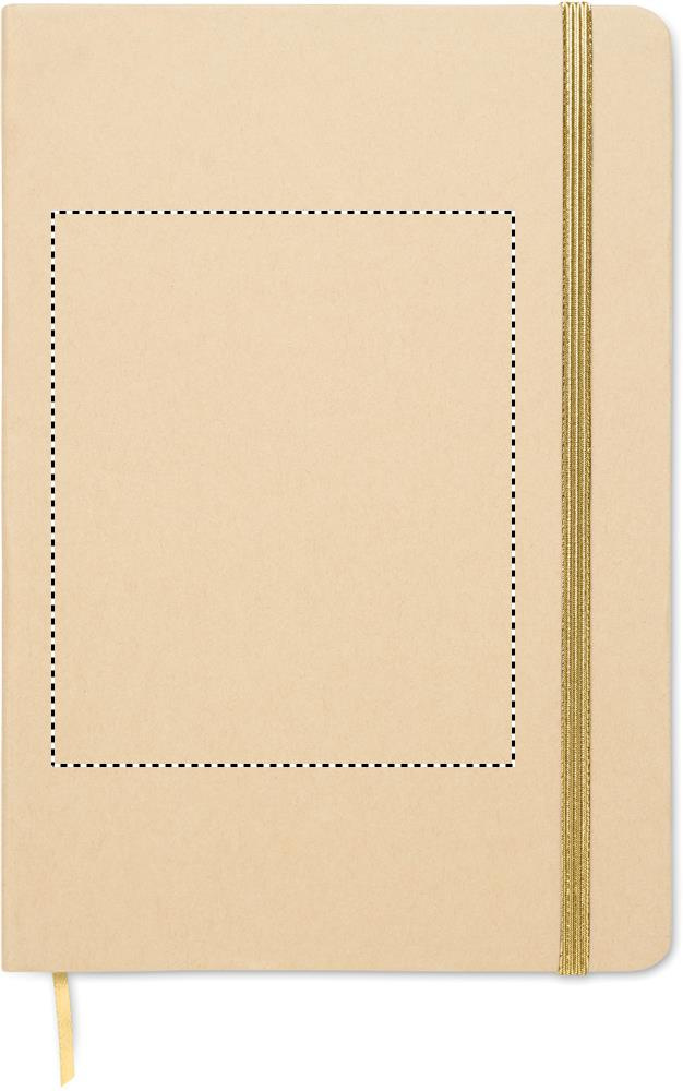 A5 notebook with hard recycled carton cover. Beige cover. Case bound. 160 lined recycled paper pages (80 sheets). Elastic closure strap, ribbon bookmark matching with revealed colour. After laser engraving the colour is revealed.