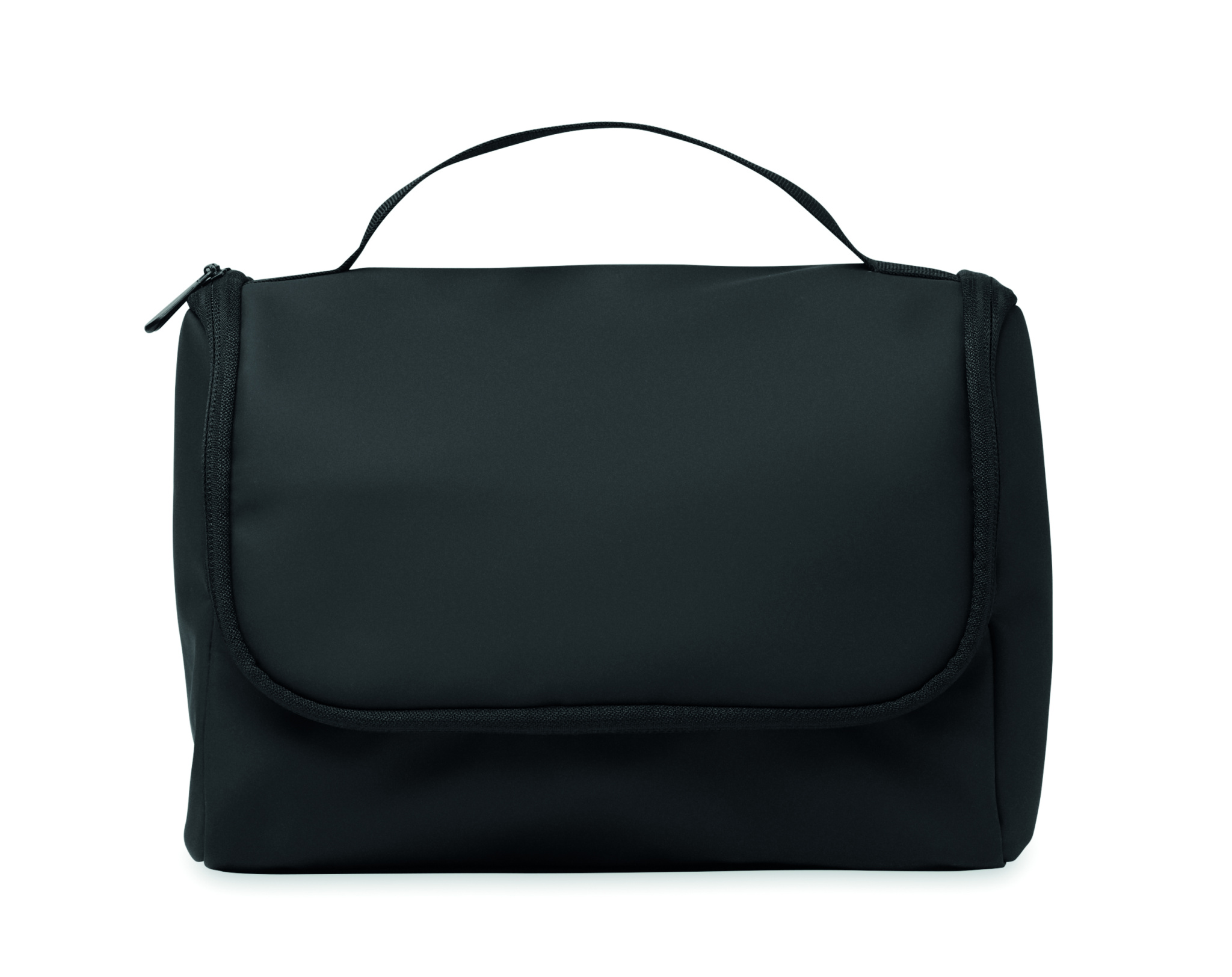Cosmetic organiser bag in soft PU with hanging hook and 210D RPET lining. One large main compartment with inner zippered mesh compartment and 1 mesh compartment.