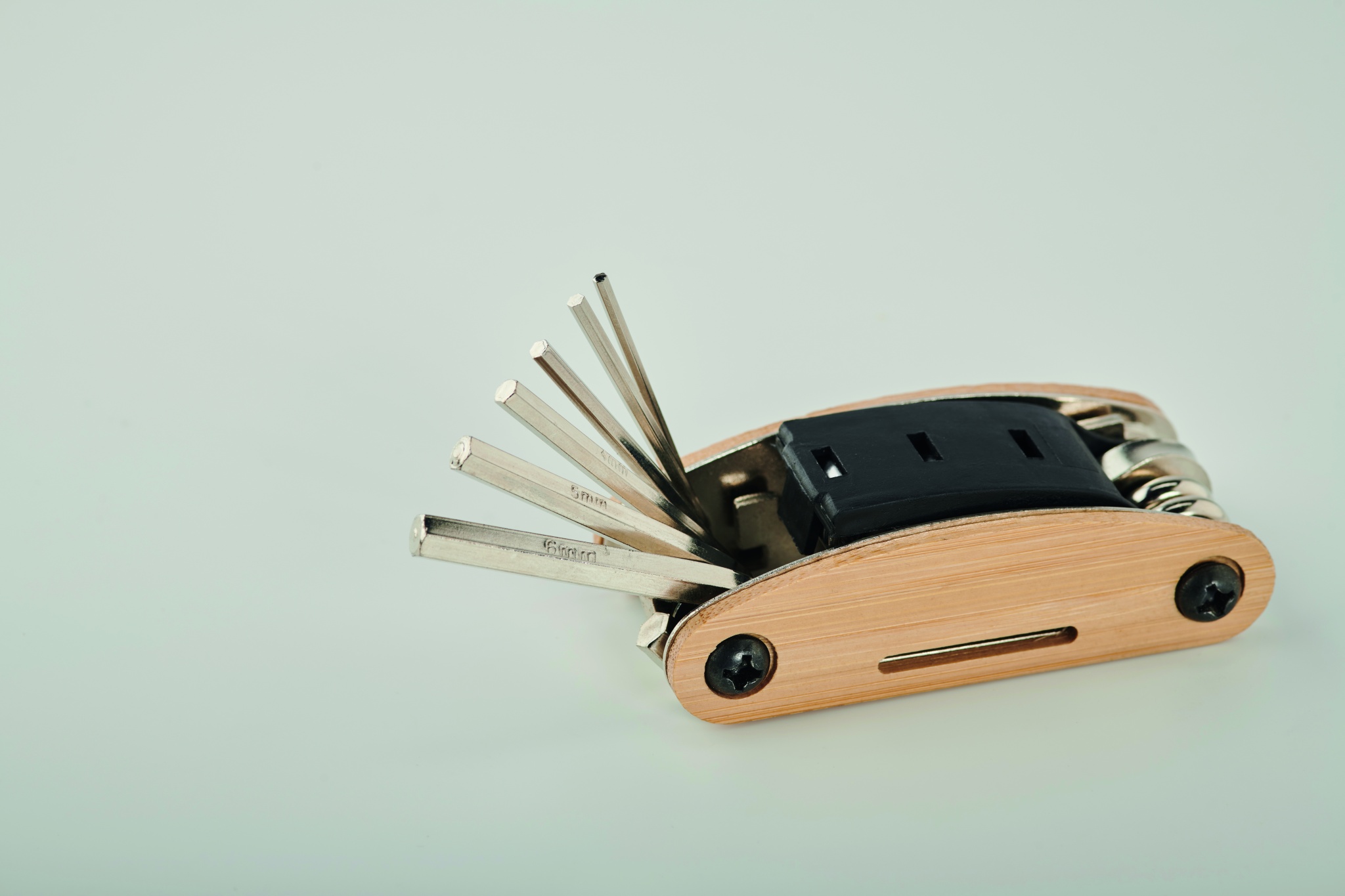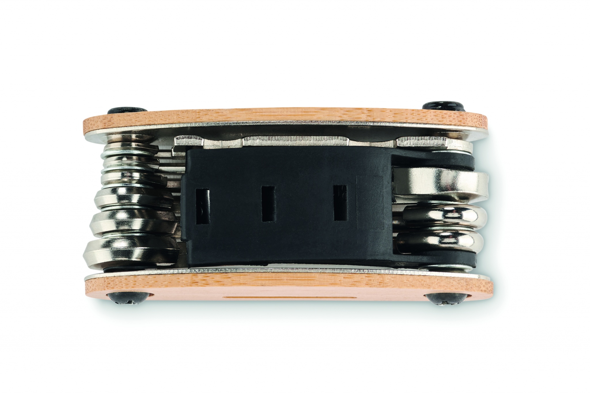 Многофункциональный карманный набор инструментов из нержавеющей стали в бамбуковом корпусе. 11 инструментов. В комплект входят: шестигранные ключи, плоский ключ, удлинитель, крестовая отвертка и торцевой ключ.