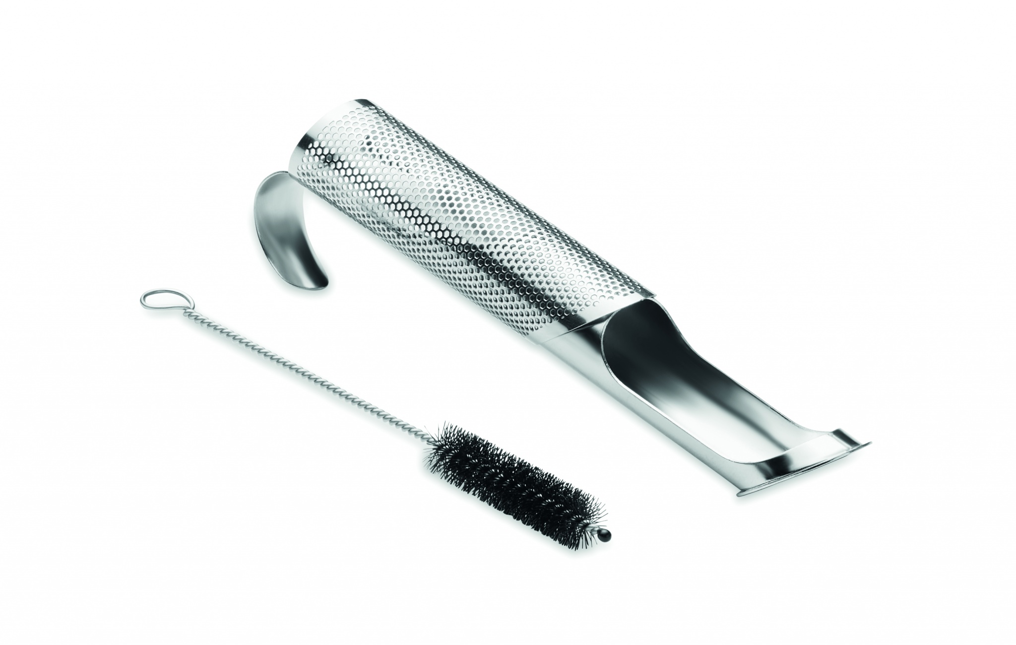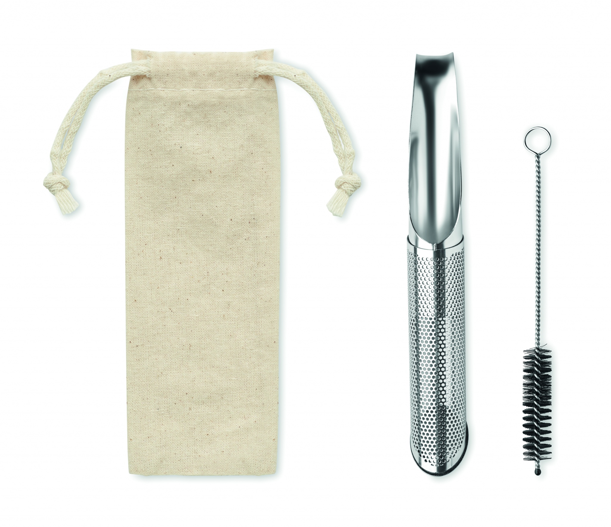 Многоразовый набор для заваривания чая из нержавеющей стали в хлопковом мешочке. В комплект входит фильтр для чая с компактным изогнутым крючком, позволяющим ему свисать над краем чашки или кружки, и щеточка для чистки.