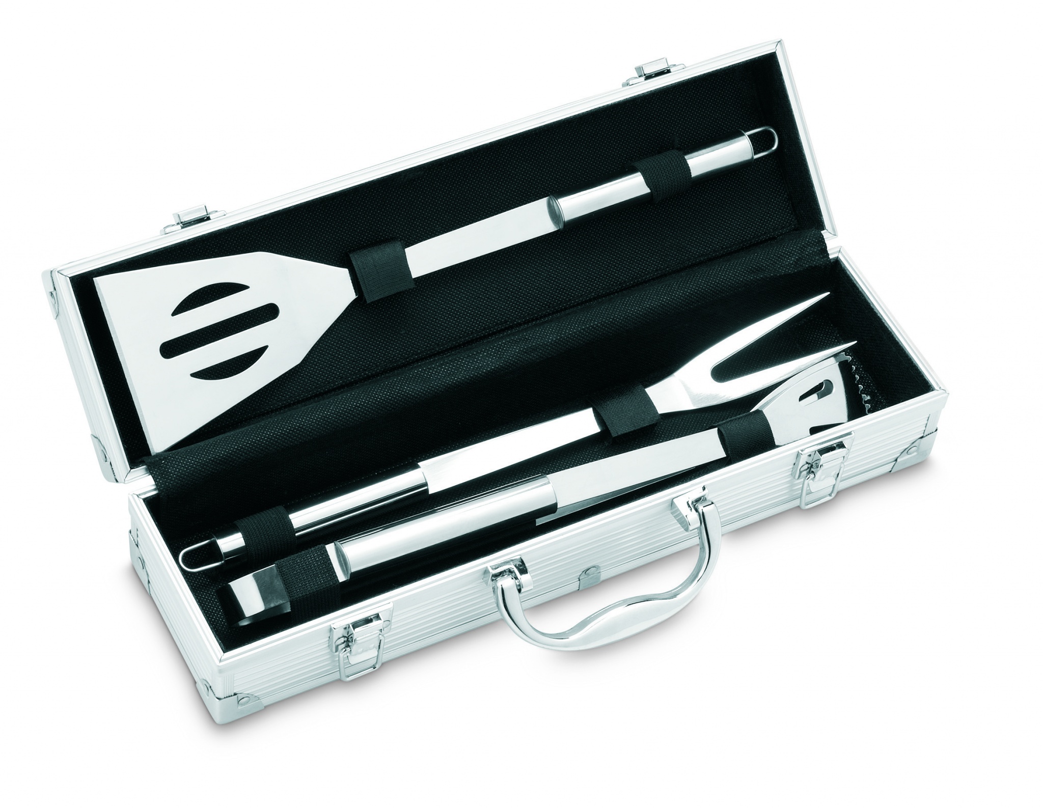 Алюминиевый чемоданчик с 3 приборами из нержавеющей стали для барбекю. Для нанесения логотипа предлагается специальная пластина.