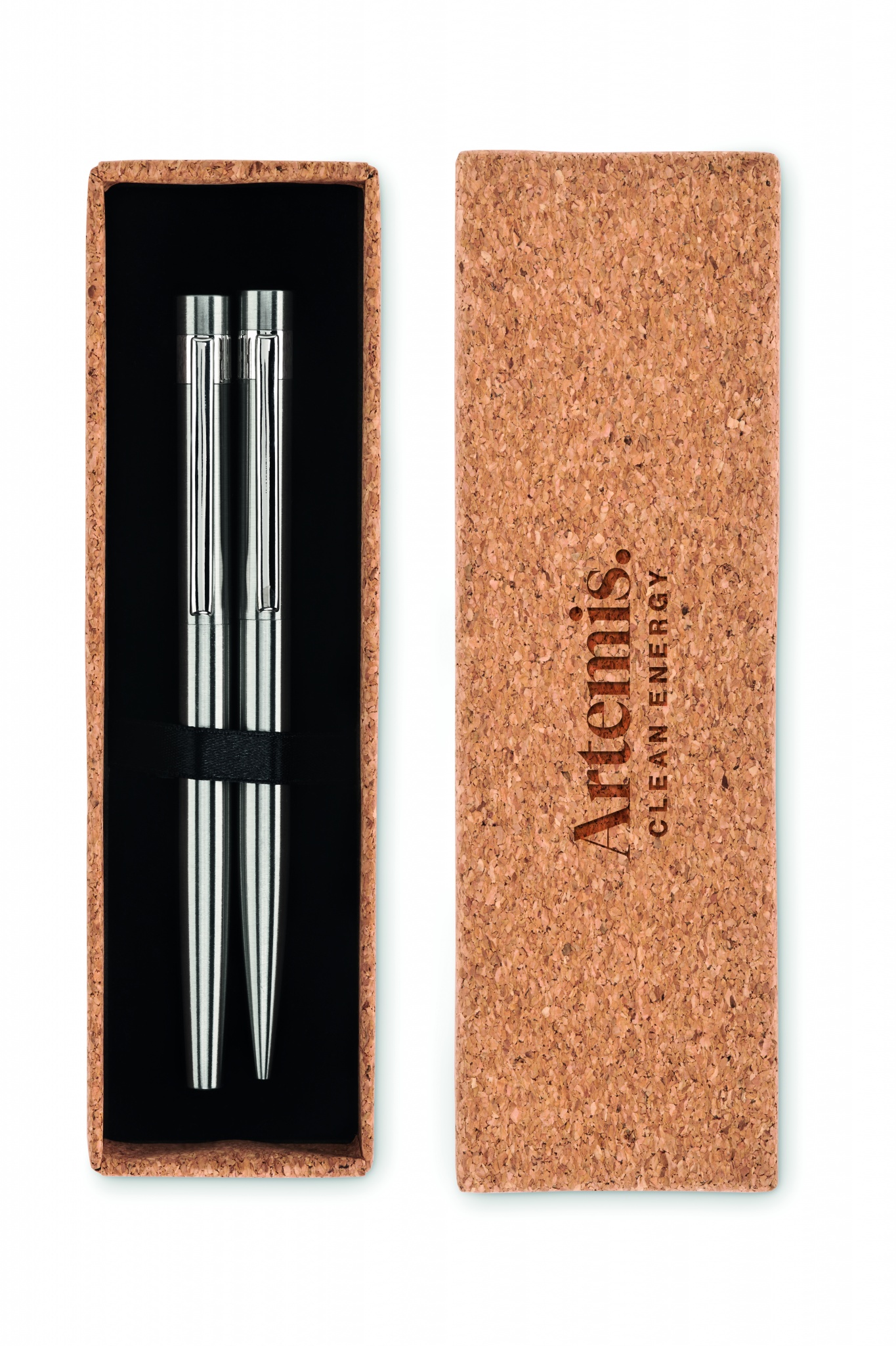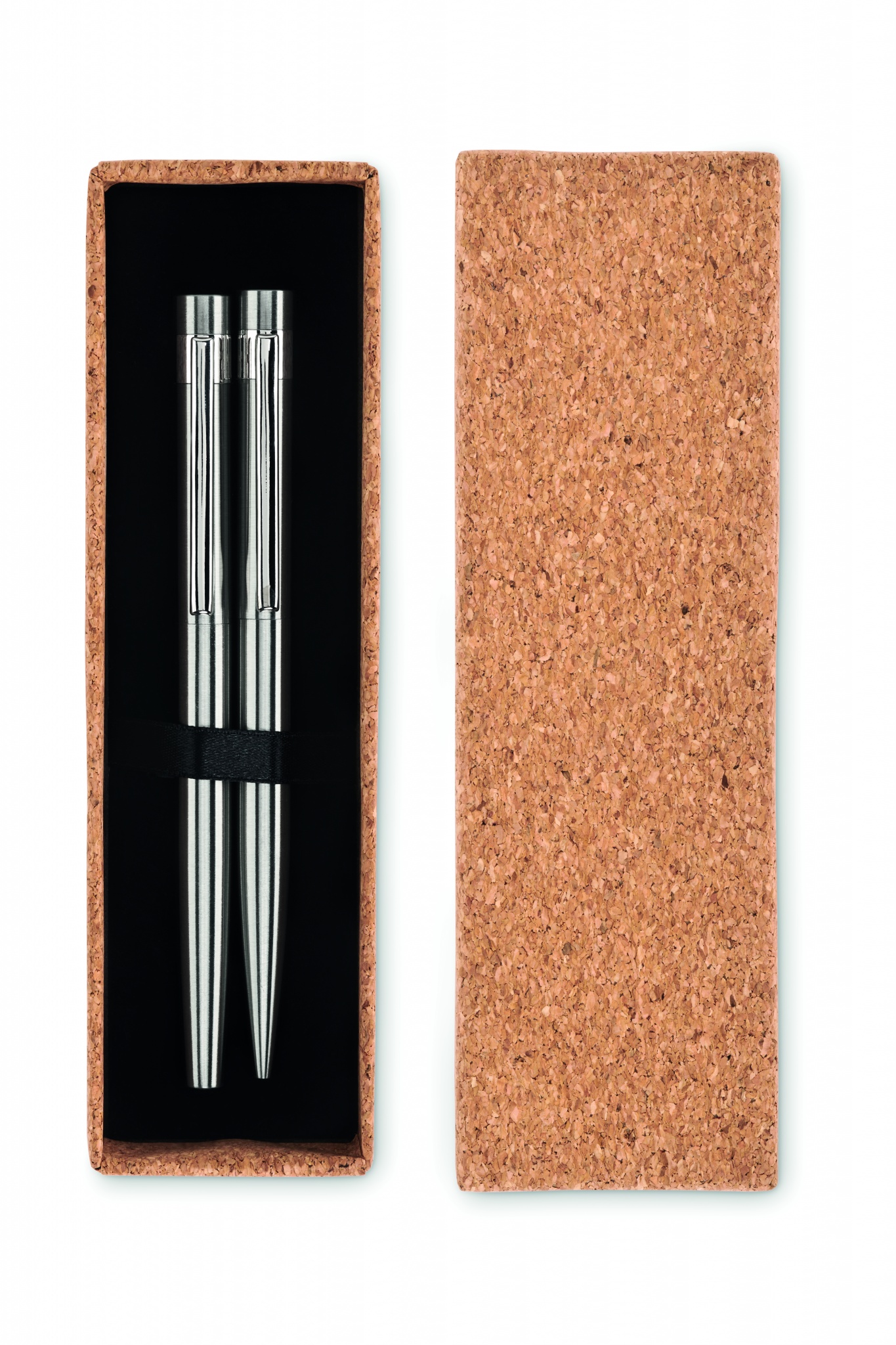 Набор ручек из переработанной нержавеющей стали. В наборе шариковая ручка и ручка-роллер. Поставляется в пробковой коробочке. Синие и черные чернила соответственно.