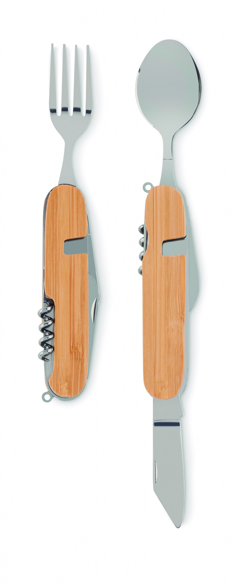 Перочинный нож со столовыми приборами в деревянном корпусе. Включает вилку, ложку, консервный нож, штопор и нож. Можно разделить набор на 2 части.