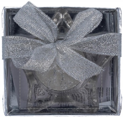 Стеклянный подсвечник со свечой в форме звезды в подарочной серебряной коробочке с прозрачной крышкой и декоративной ленточкой.