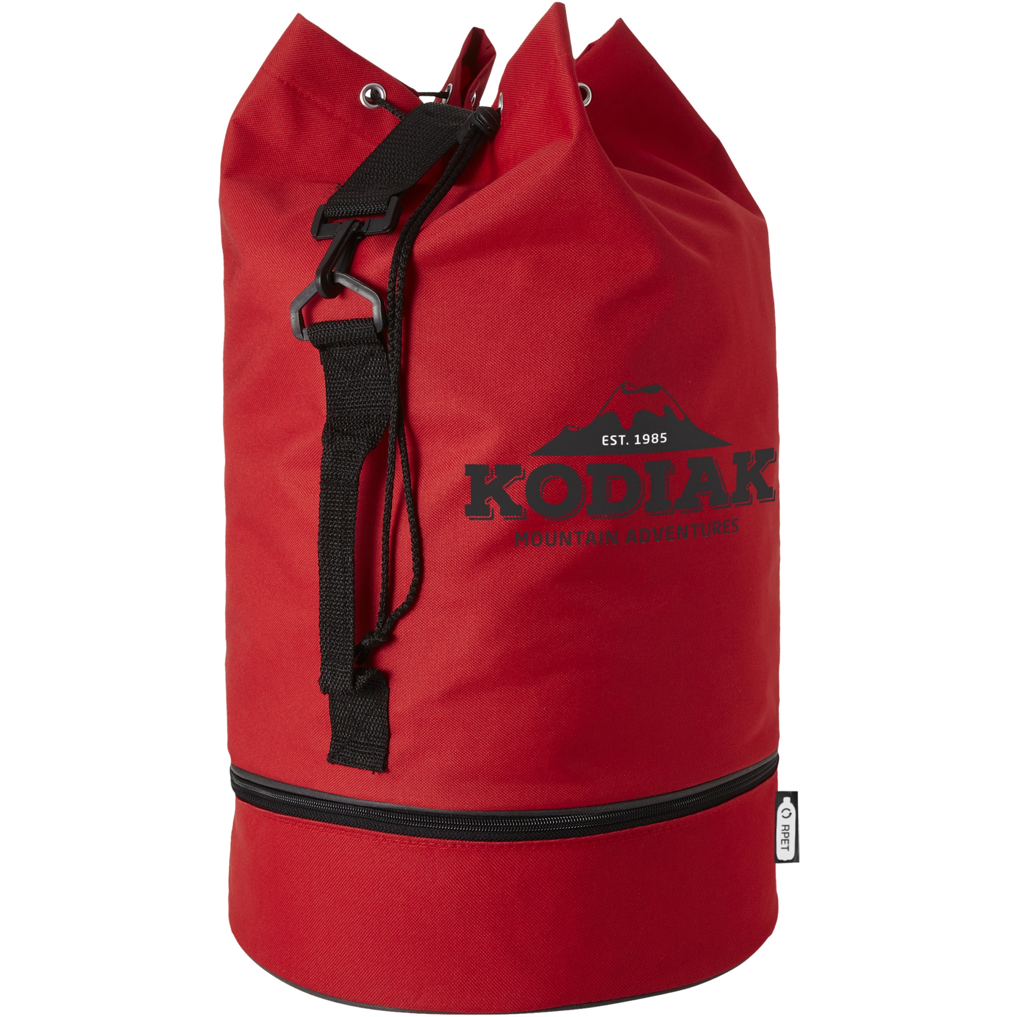 Водонепроницаемый спортивный вещмешок из переработанного РЕТ-пластика с вместительным 20 основным отделением объемом 20 литров, застежкой на шнурке, боковой ручкой и регулируемым плечевым ремнем. Также имеет отдельное нижнее отделение на молнии для небольших предметов.