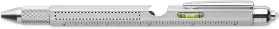 Поворотная шариковая ручка из нержавеющей стали с уровнем и линейкой. Есть также стилус, насадки для отверток с крестообразной и плоской головкой, фонарик. 3 батарейки AG в комплекте. Синие чернила.