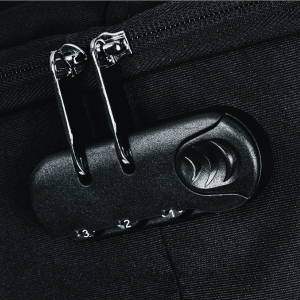 Защитный рюкзак с функцией защиты от кражи. Вход в основное отделение рюкзака обращен к вашей сумке, что затрудняет доступ посторонних лиц. Рюкзак также имеет замок для фиксации молнии и скрытый карман для платежной карты или ключей. Во внутренней части имеется мягкое отделение для 15-дюймового ноутбука и 10-дюймового планшета. Также в комплект входит выход USB с USB-кабелем. Сзади находится ремень для крепления к чемодану. Передняя поверхность оснащена светоотражающим аксессуаром. Объем рюкзака составляет 20,5 л.