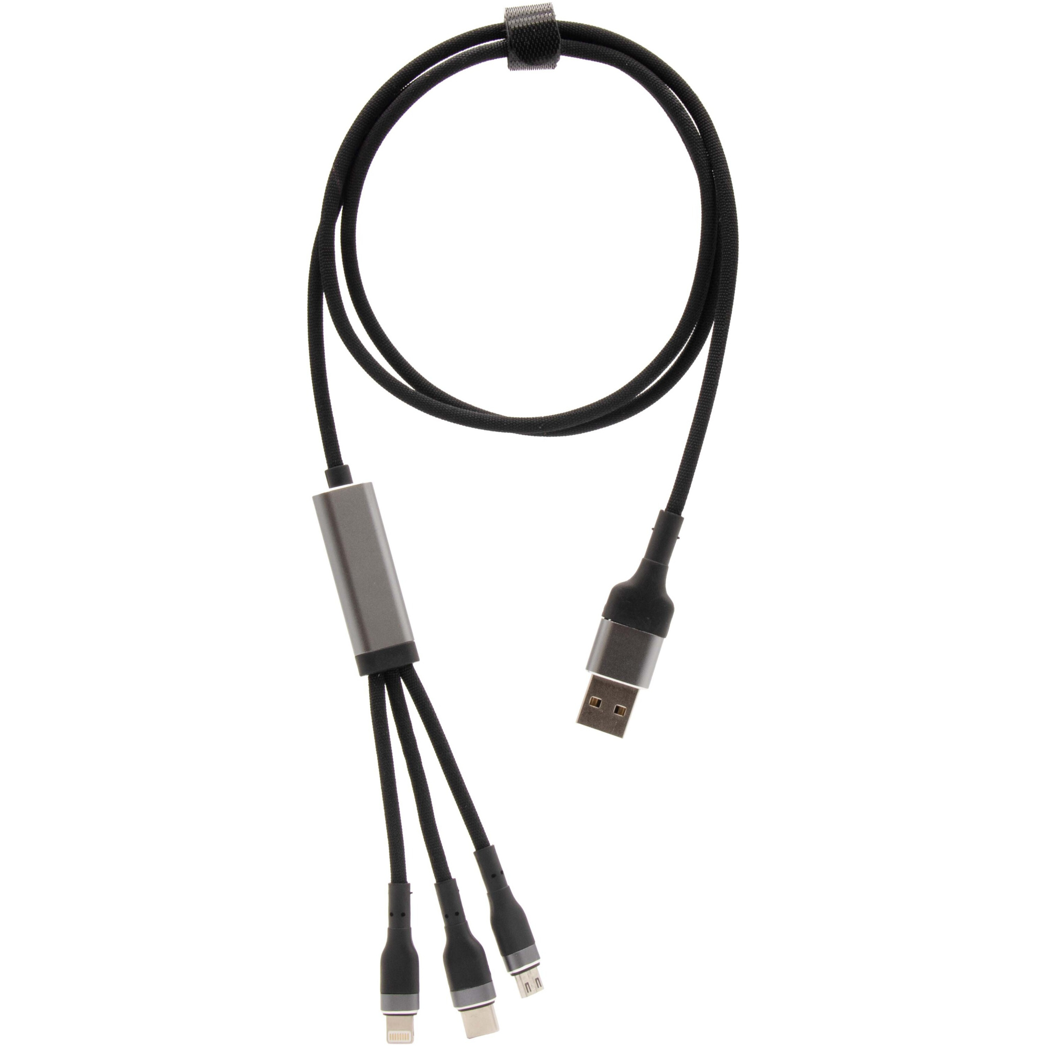 Кабель для сверхбыстрой заряжки 5-в-1, изготовленный из rPET, мощностью 100 Вт, которым можно заряжать смартфоны, планшеты и ноутбуки. Двойной вход USB-A + USB-C делает кабель на 100% совместимым с новейшими моделями компьютеров. Выходная мощность: Type-C, Micro USB и Lightning. Поставляется с чехлом из перерабатываемого TPU и вкладышем, напечатанным на переработанной бумаге. Длина кабеля: 1 метр
