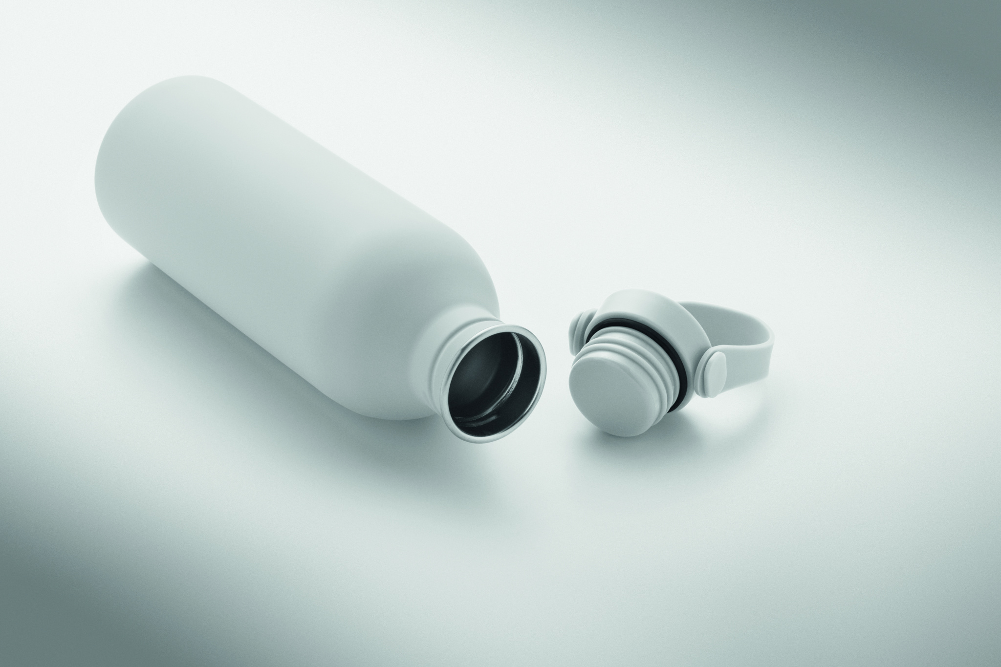 Single wall bottle made of 90 % recycled stainless steel and 10% stainless steel with rubber finish. Includes PP and SS lid with silicone handle. Capacity: 500 ml.