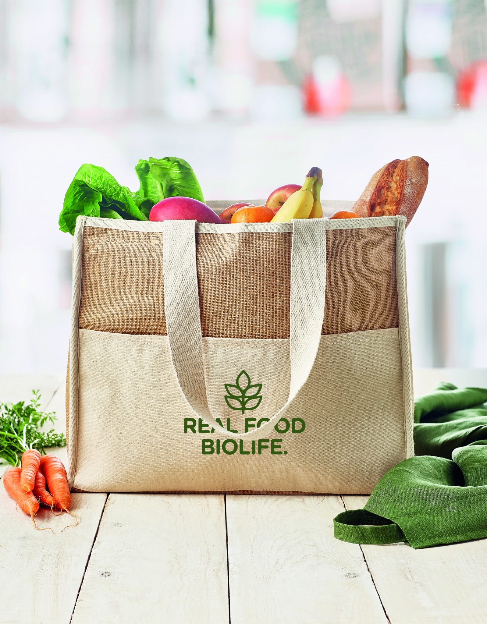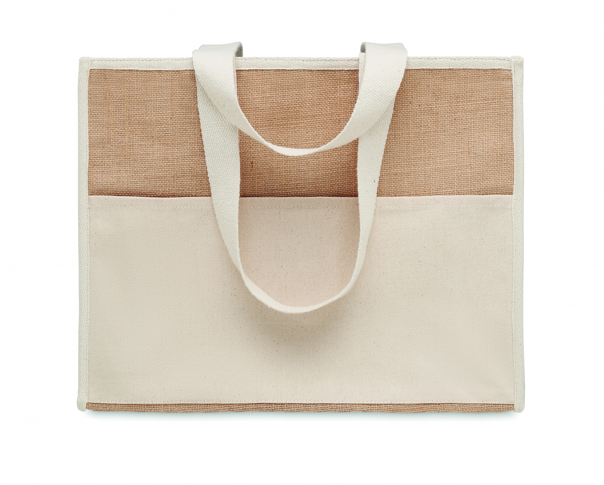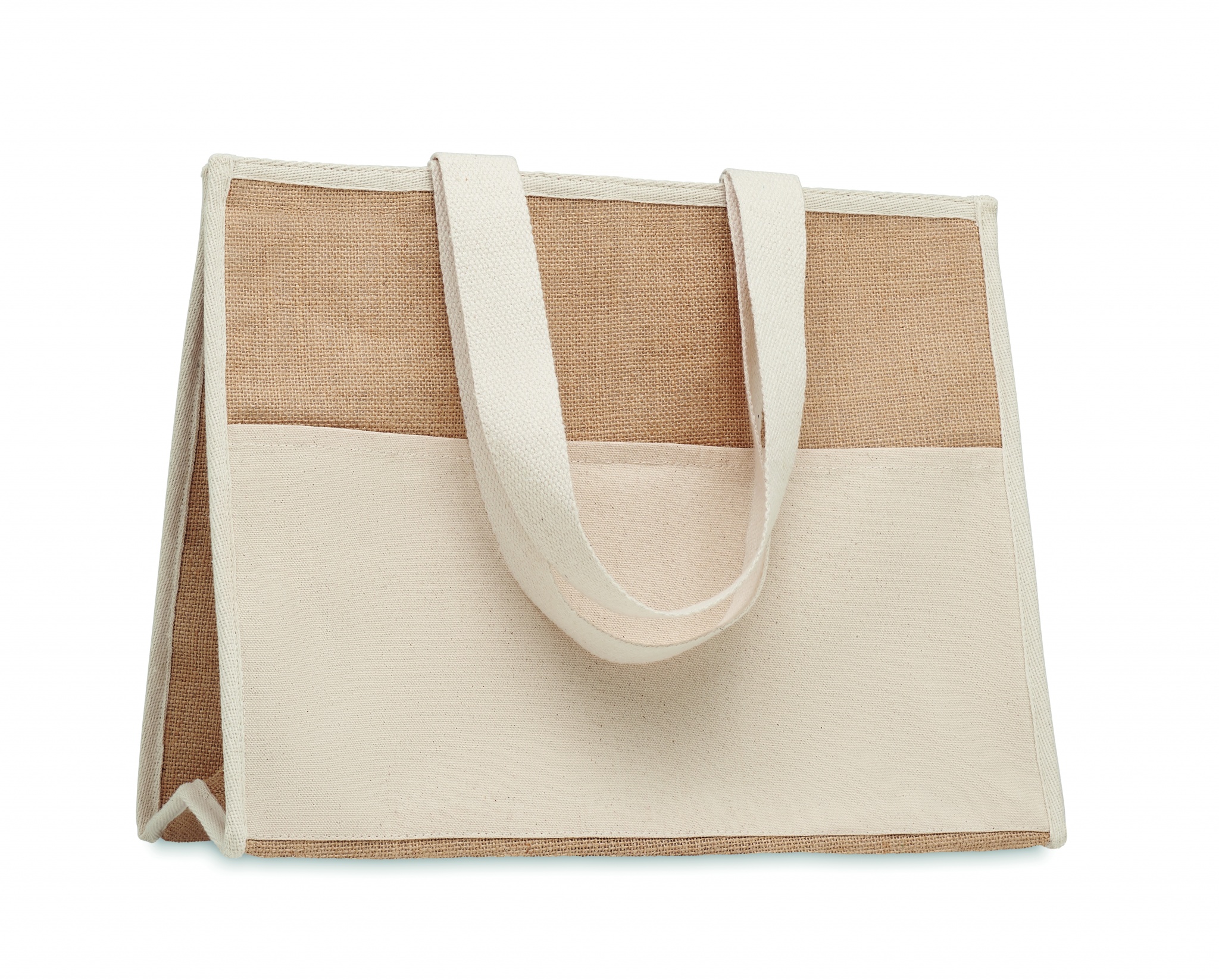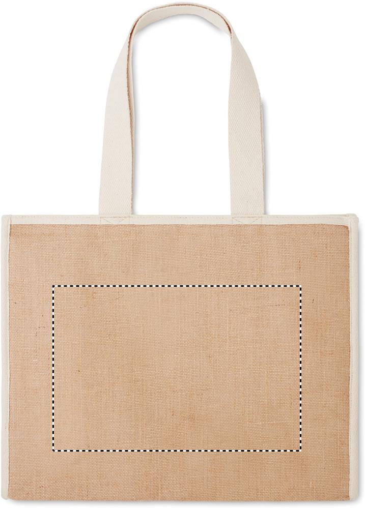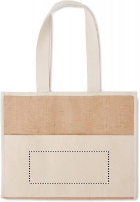 Сумка для покупок из джута с длинными ручками, ламинированная, с застежкой на петлю. Спереди холщовый карман и хлопковая тесьма.