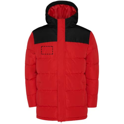 Утепленная куртка с фиксированным капюшоном. Передняя молния прикрыта планкой. Защита подбородка. Два боковых кармана на молнии. Эластичные манжеты.