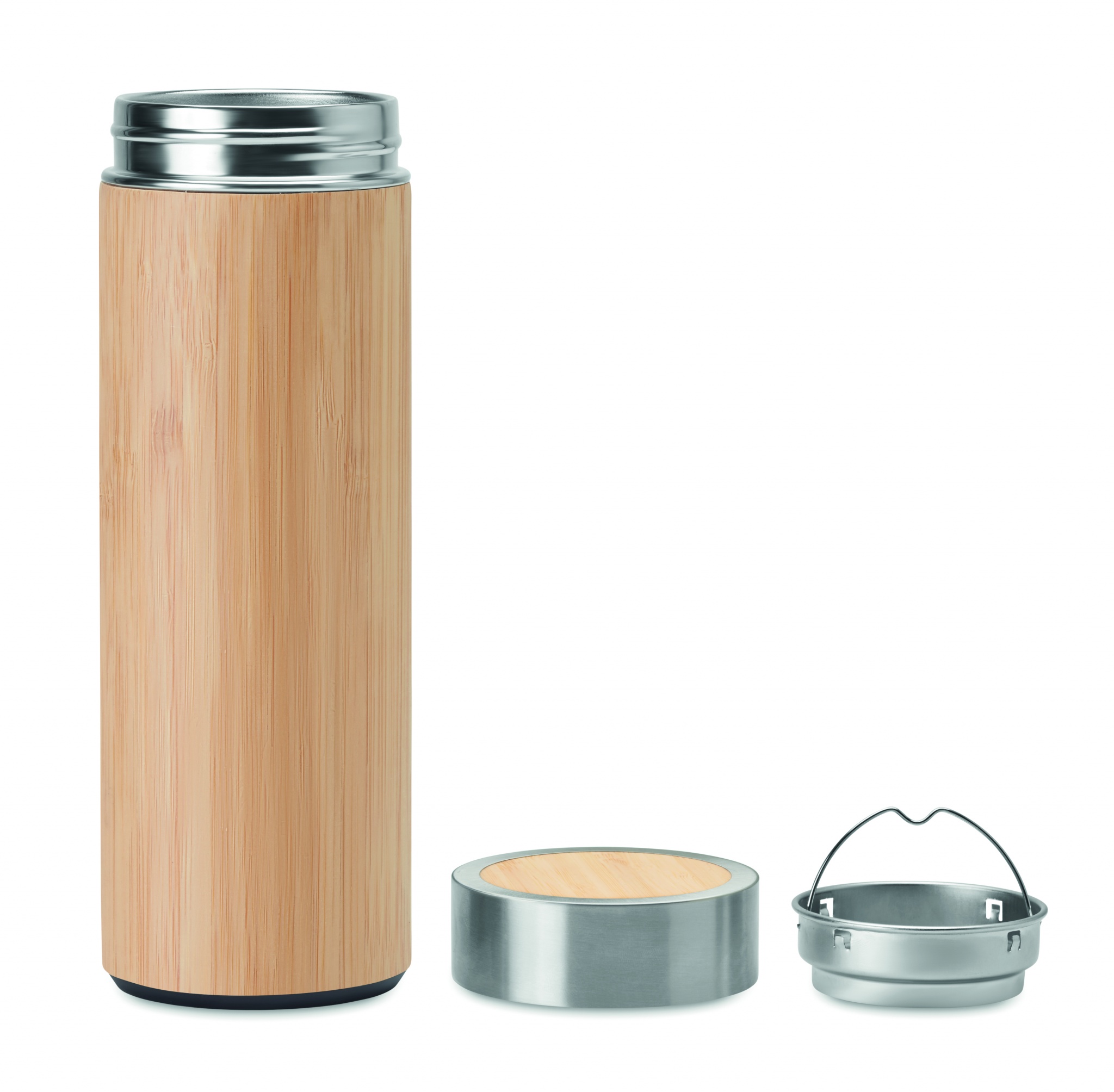 Термос двустенчатый из нержавеющей стали, декорированный бамбуком. Внутри чайное ситечко. Объем 400 мл.