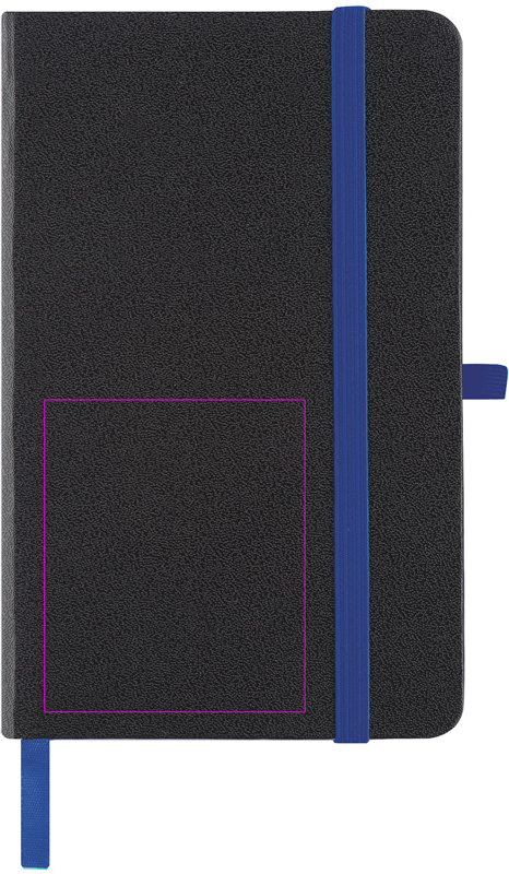 Блокнот с черной обложкой из полиуретана и 160 линованными страницами. Элегантный вид благодаря красочным акцентам. Мы напечатаем ваш логотип на обложке.