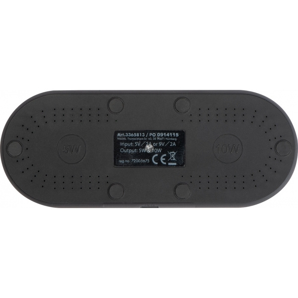 Тонкая пластиковая зарядная станция с бамбуковой поверхностью и двумя индукционными зарядными точками для смартфонов, включая кабель для зарядки. Ваш логотип будет выгравирован на станции.