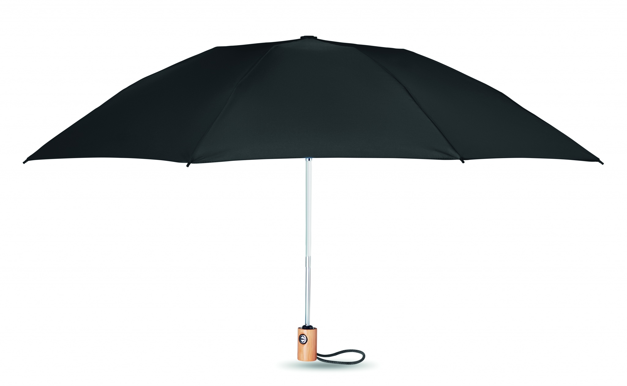 Зонт реверсивный 23-дюймовый из эпонжа RPET 190T. Автомат. Спицы из стекловолокна. Бамбуковая ручка с хлопковым ремешком на запястье. Футляр так же RPET.