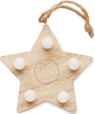 Деревянная звезда (80% тополя и 20% древесной стружки) с 5 светодиодными лампочками и шнурком для подвешивания. Включает 1 батарейку CR2032.