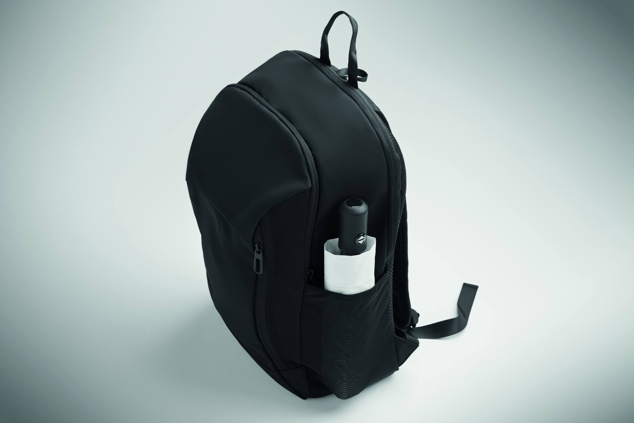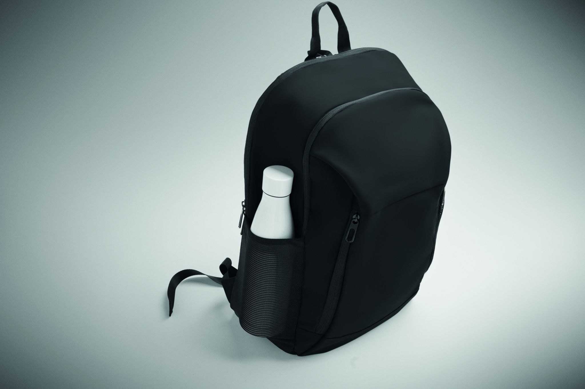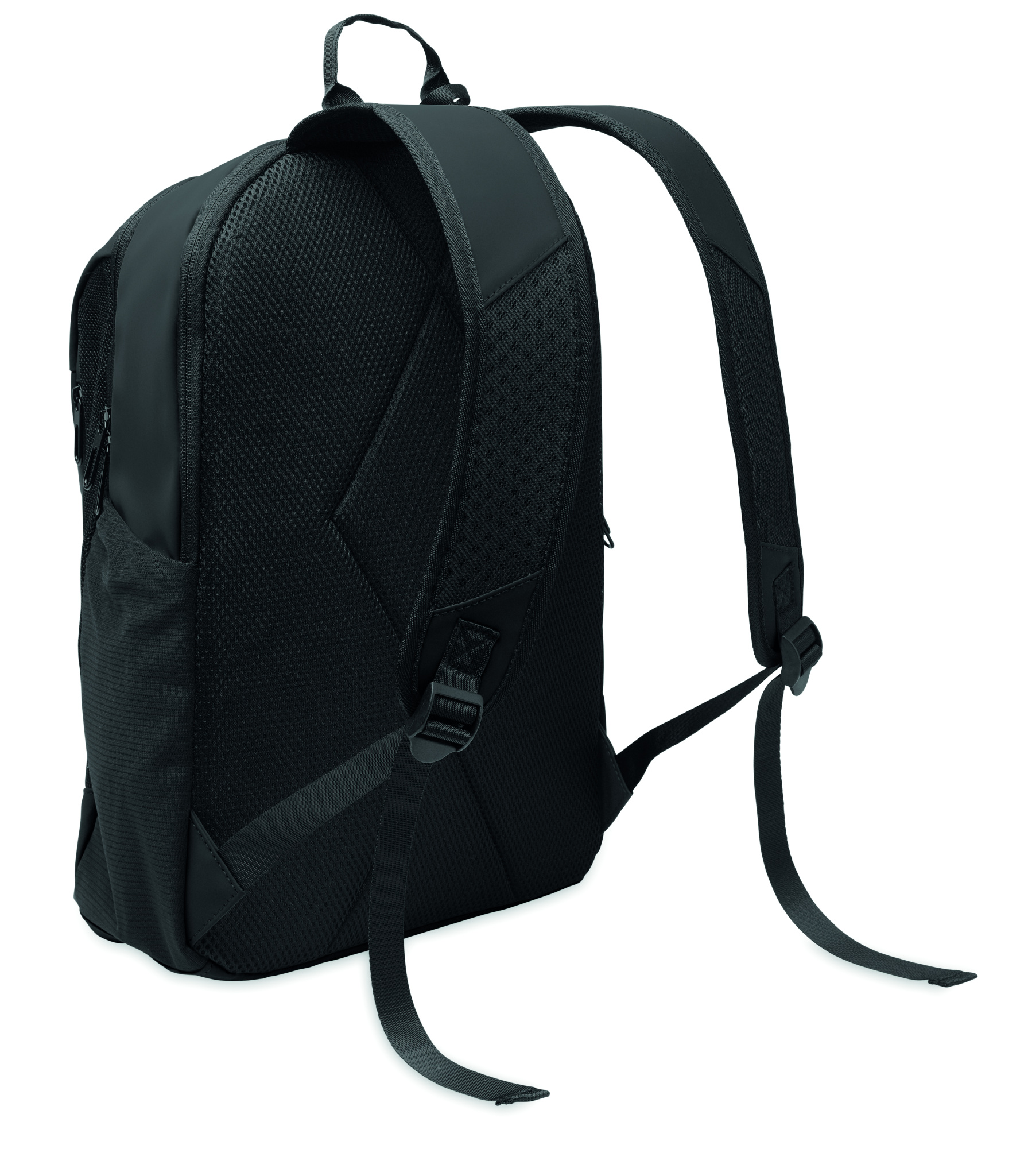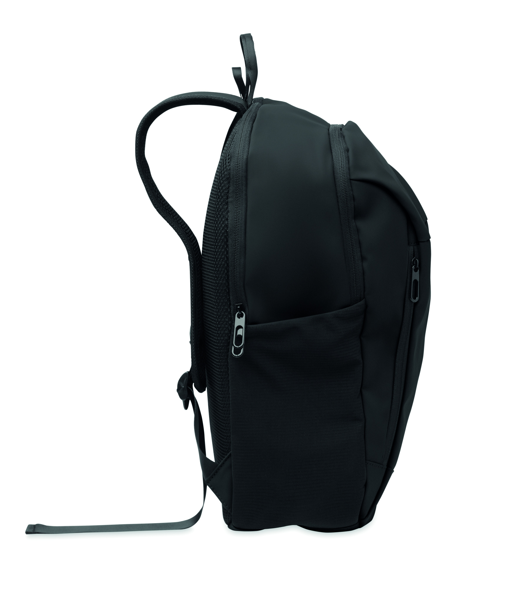15 tums dataryggsäck i mjuk PU med vadderad rygg och dolt huvudfack med dragkedja. 1 framficka med dragkedja, 2 sidofickor med dragkedja och 2 sidofickor i elastiskt nät. Med foder i 210D RPET.