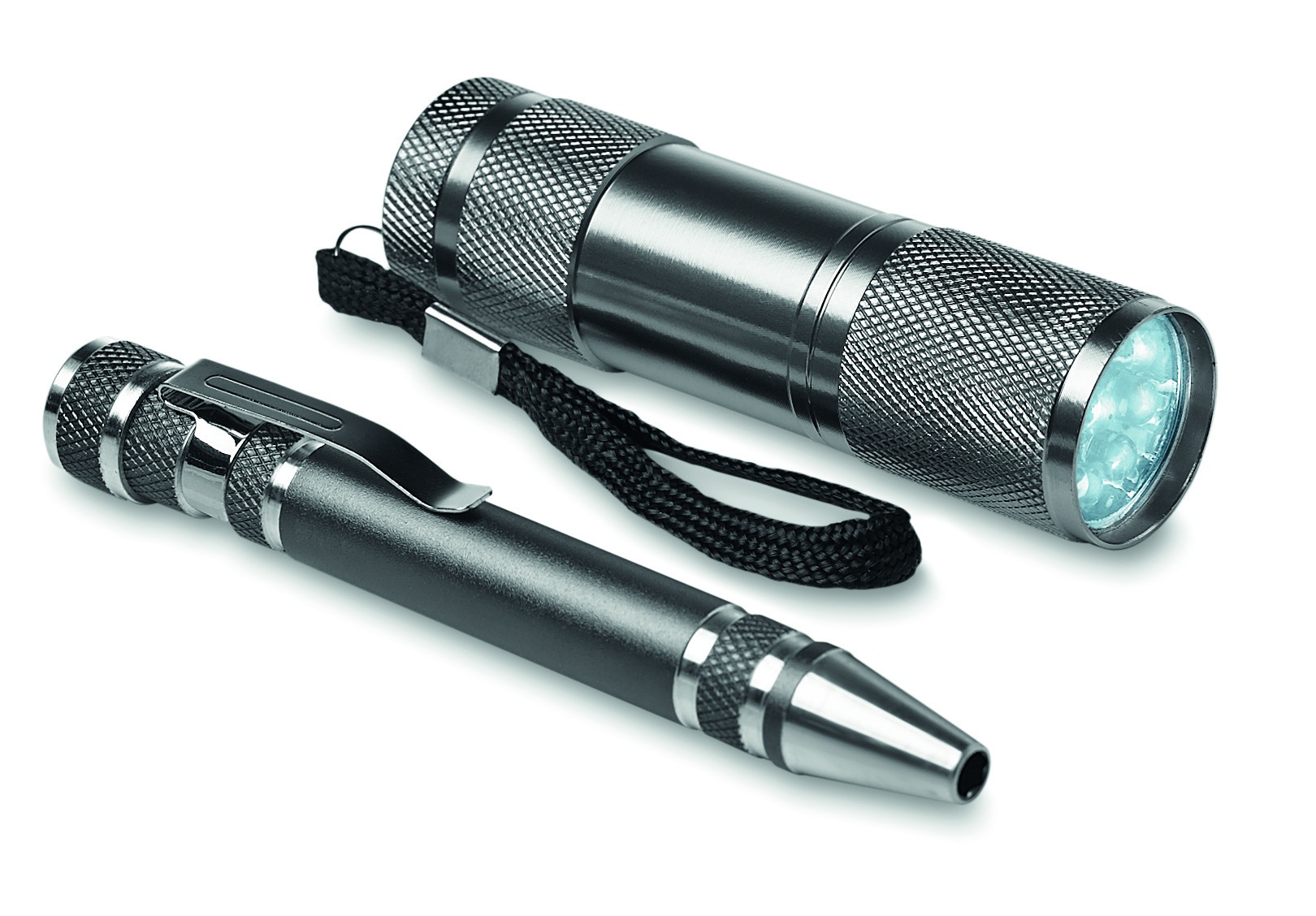 Verktygsset med 9 LED ficklampa och multiverktyg i aluminium, pennformad. Inkluderar 3 slitsade och 3 stjärnskruvmejsel huvuden. Drivs av 3 AAA batterier som inte ingår men kan köpas till, se art.nr. KC1806-99. Levereras i fin presentask.