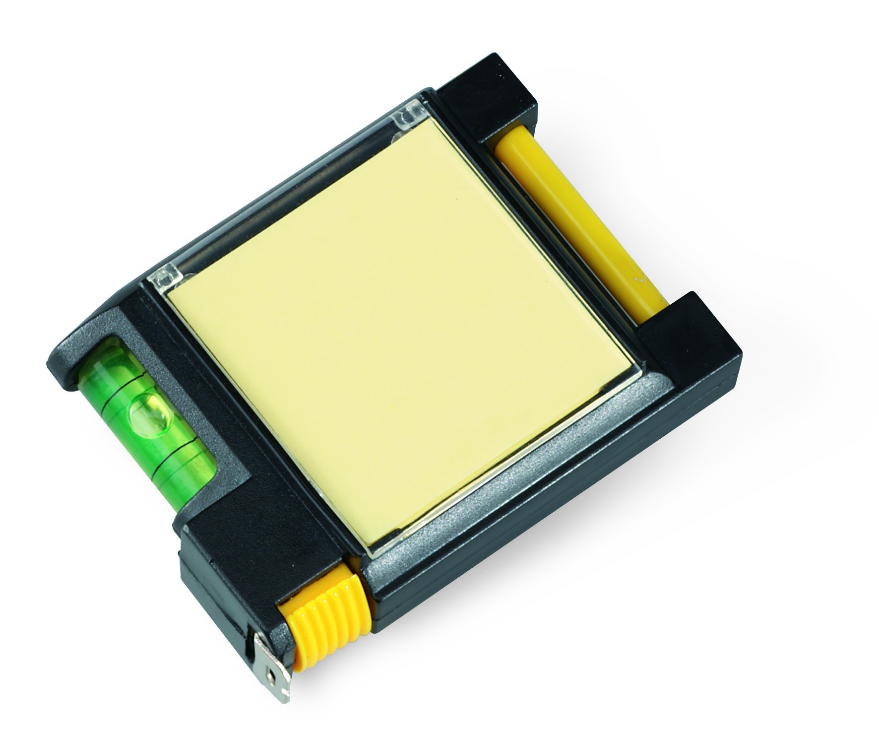 Måttband med memoblock, kulspetspenna och vattenpass. Längd 2 meter.