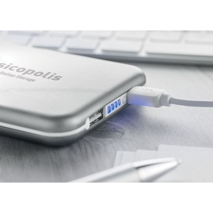 Power Bank med solcellsladdning i aluminium. Kapaciteten är 4000 mAh och den kan ladda en smartphone c 2 ggr beroende på modell, output: DC5V / 1A. Indikatorlampa. USB-kabel med mikro-USB-kontakt ingår.