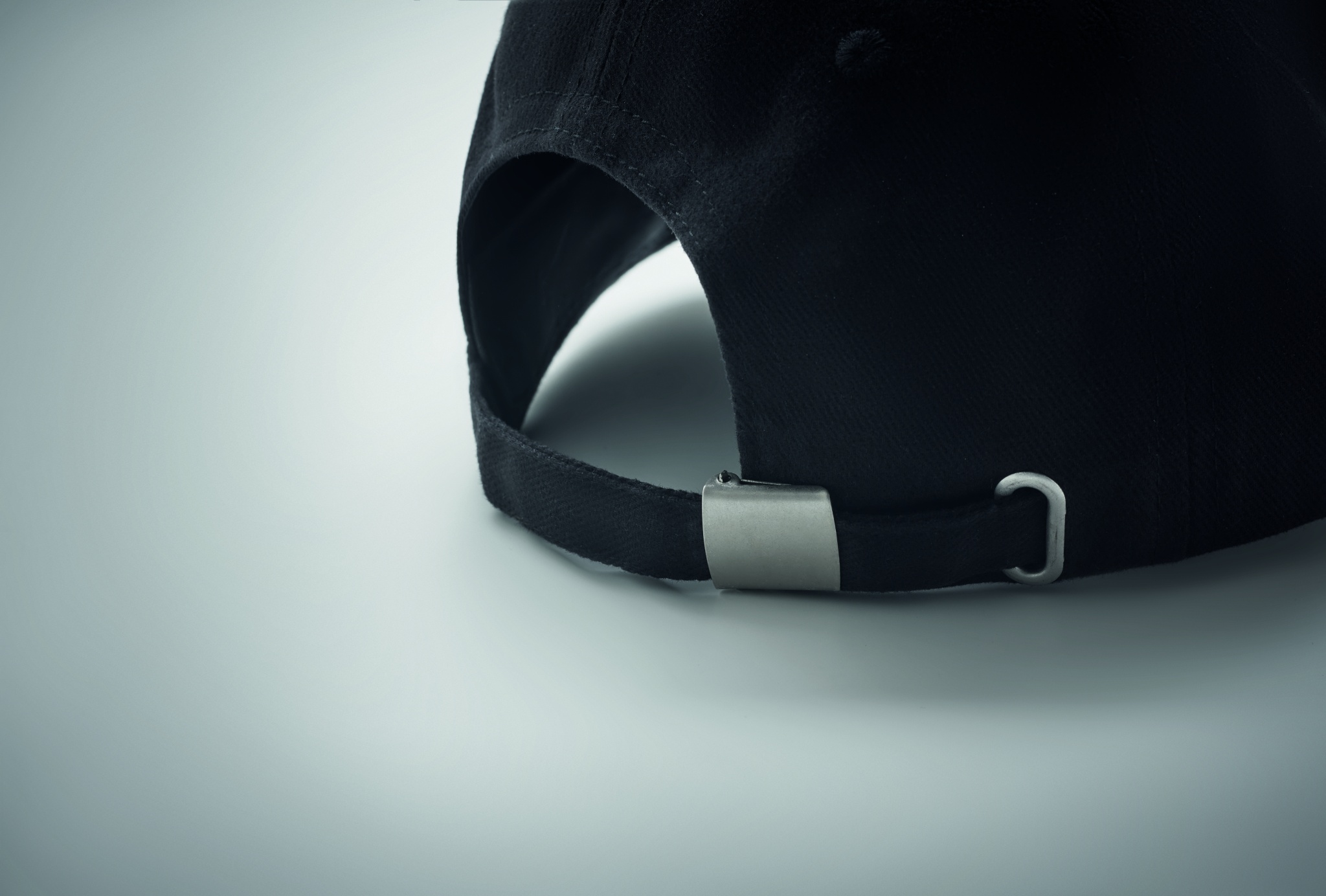 Baseballkeps med 5 paneler i kraftig borstad twill bomull 260 g/m2 med silverstålspänne. 4 broderade öglor i matchande färg. Storlek 7 1/4.