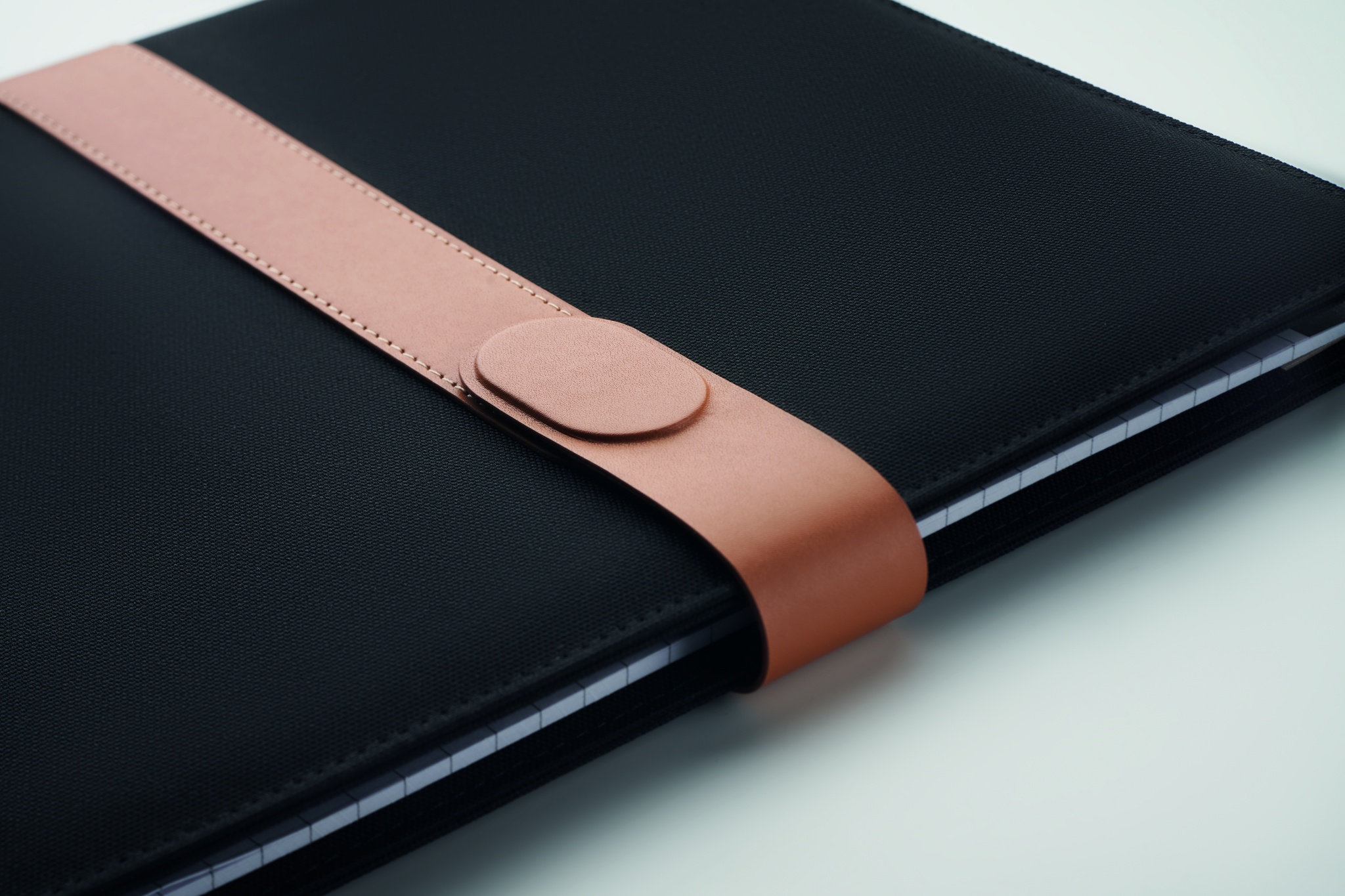 A4 konferensmapp i RPET med detaljer i konstläder. Utbytbara A4-anteckningsblock, 30 linjerade sidor med återvunnet papper. Pennhållare. 4 korthållare, 3 små fickor och ett stort fack. Magnetisk stängning.