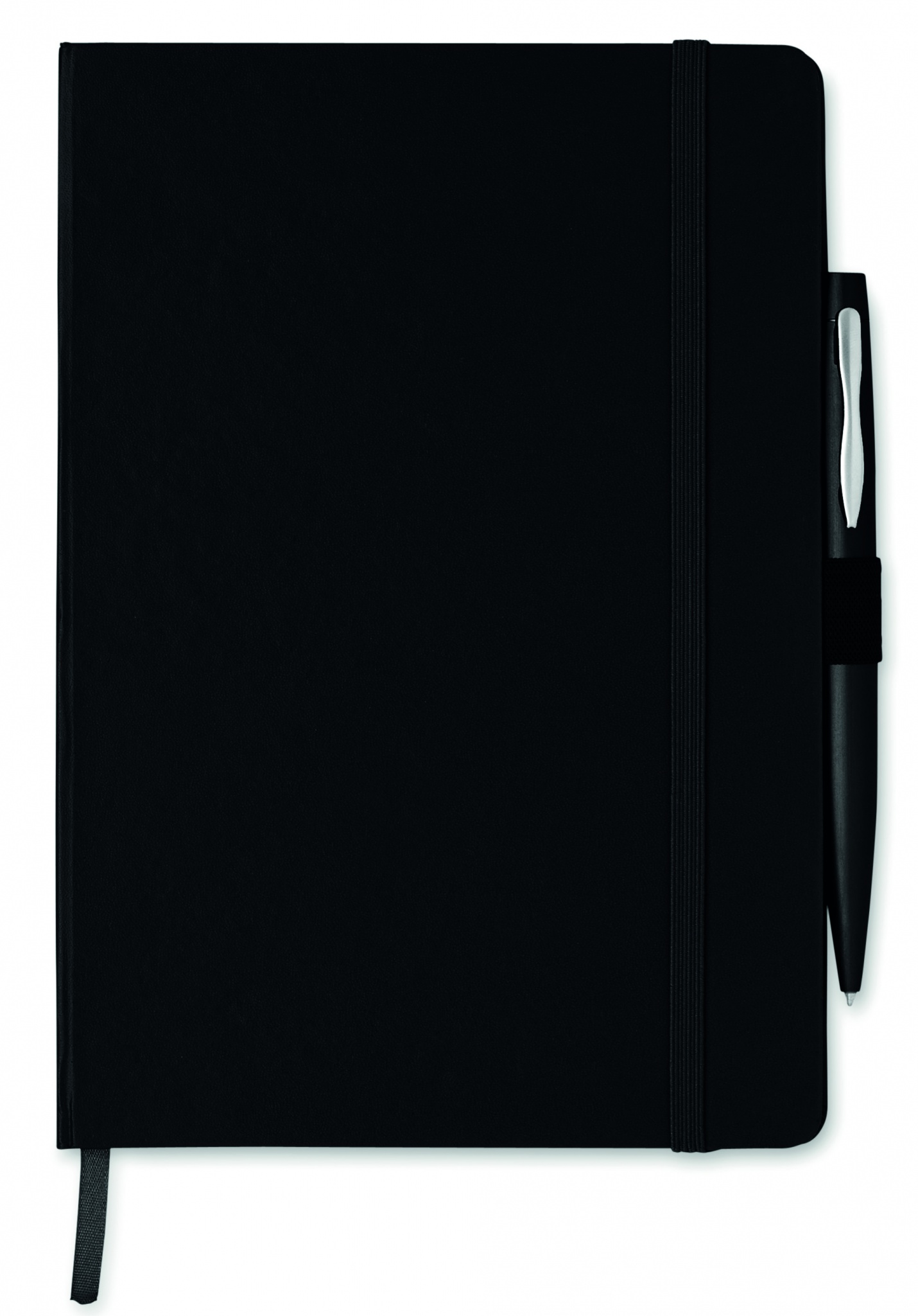 A5 inbunden anteckningsbok med hård pärm i PU, 72 blad linjerat papper, gummiögla och bokmärkesband i satin. Inklusive kulspetspenna i metall med blått bläck.