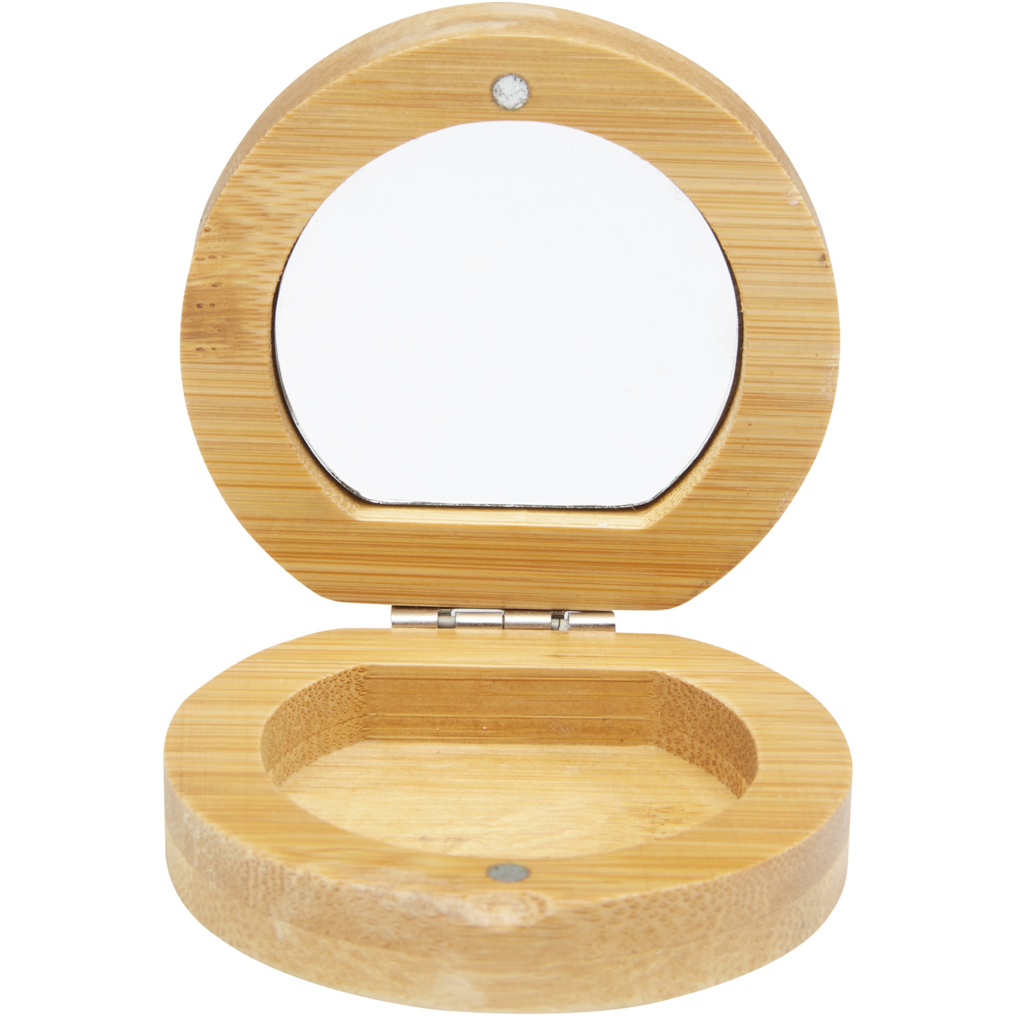 Kompakt fickspegel av bambu för resor eller användning för daglig hudvård eller makeup. Det finns ett litet fack i botten på spegeln för små tillbehör. Den använda bambun kommer från och produceras enligt hållbara standarder.