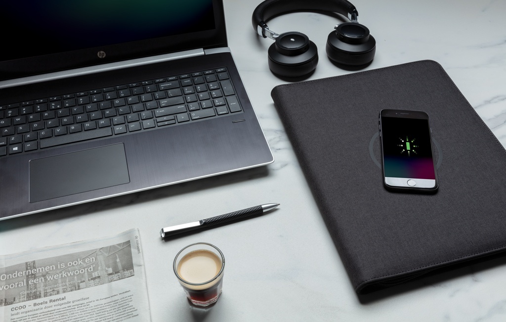 Logotrade presentreklam bild: Air A4 portfolio med trådlös laddning och powerbank
