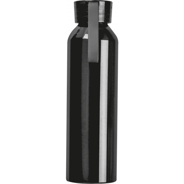 Vattenflaska tillverkad av återvunnet aluminium med plastlock, silikonbärrem och en kapacitet på 600 ml. Miljövänlig och praktisk för användning på språng.