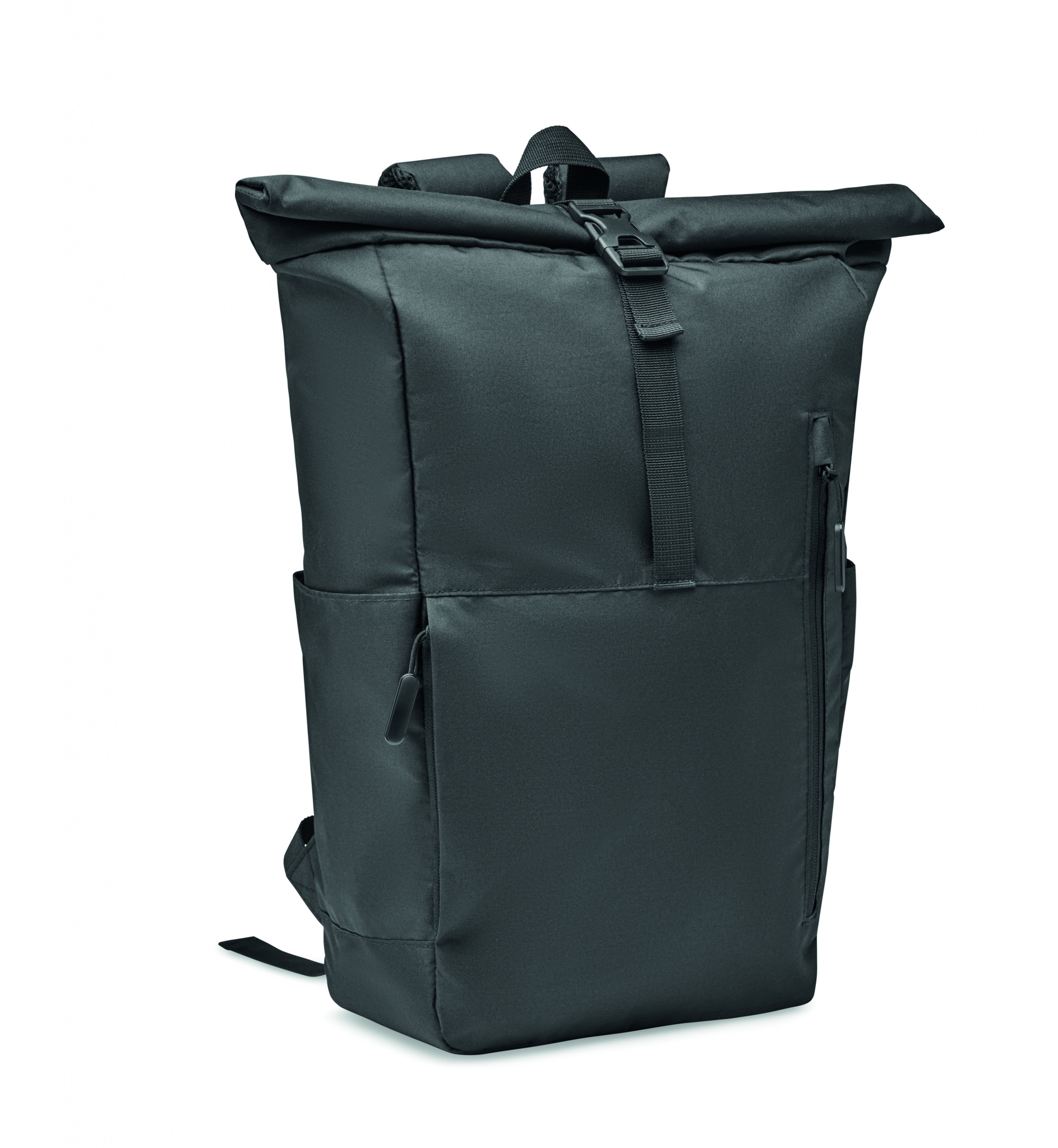 15 tums dataryggsäck med rullstägning i 300D RPET polyester. Stor frontficka med dragkedja, dold sidoficka med liten karbinhake på insidan. Karbinhaken är ej för klättring (profesinell användning)